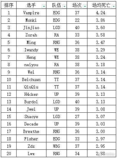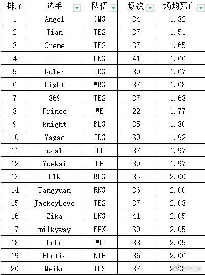 常规赛阵亡榜新鲜出炉,场均阵亡方面EDG二人包揽前二令人难绷。OMG的Angel场均阵亡最少领先TES中野。