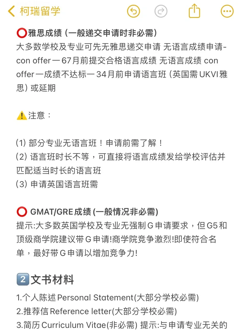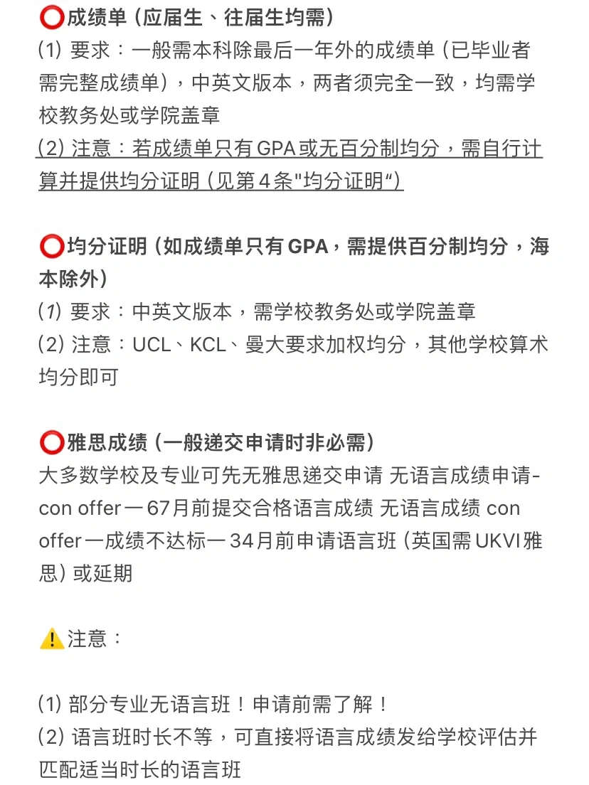 ❗雅思成绩:一般不是必需。可无雅思先交,后补语言成绩。注意语言班及 UKVI 雅思要求。
