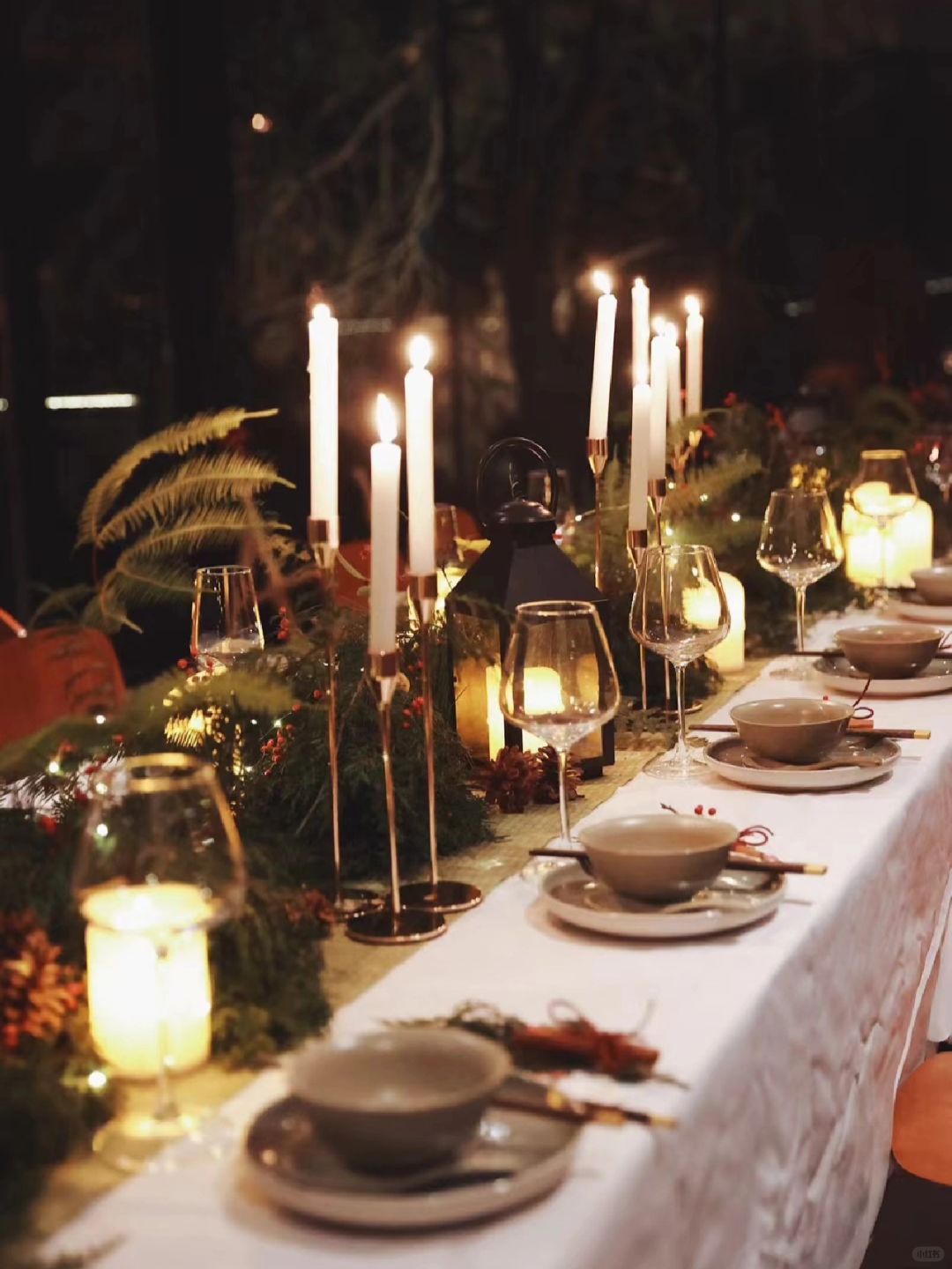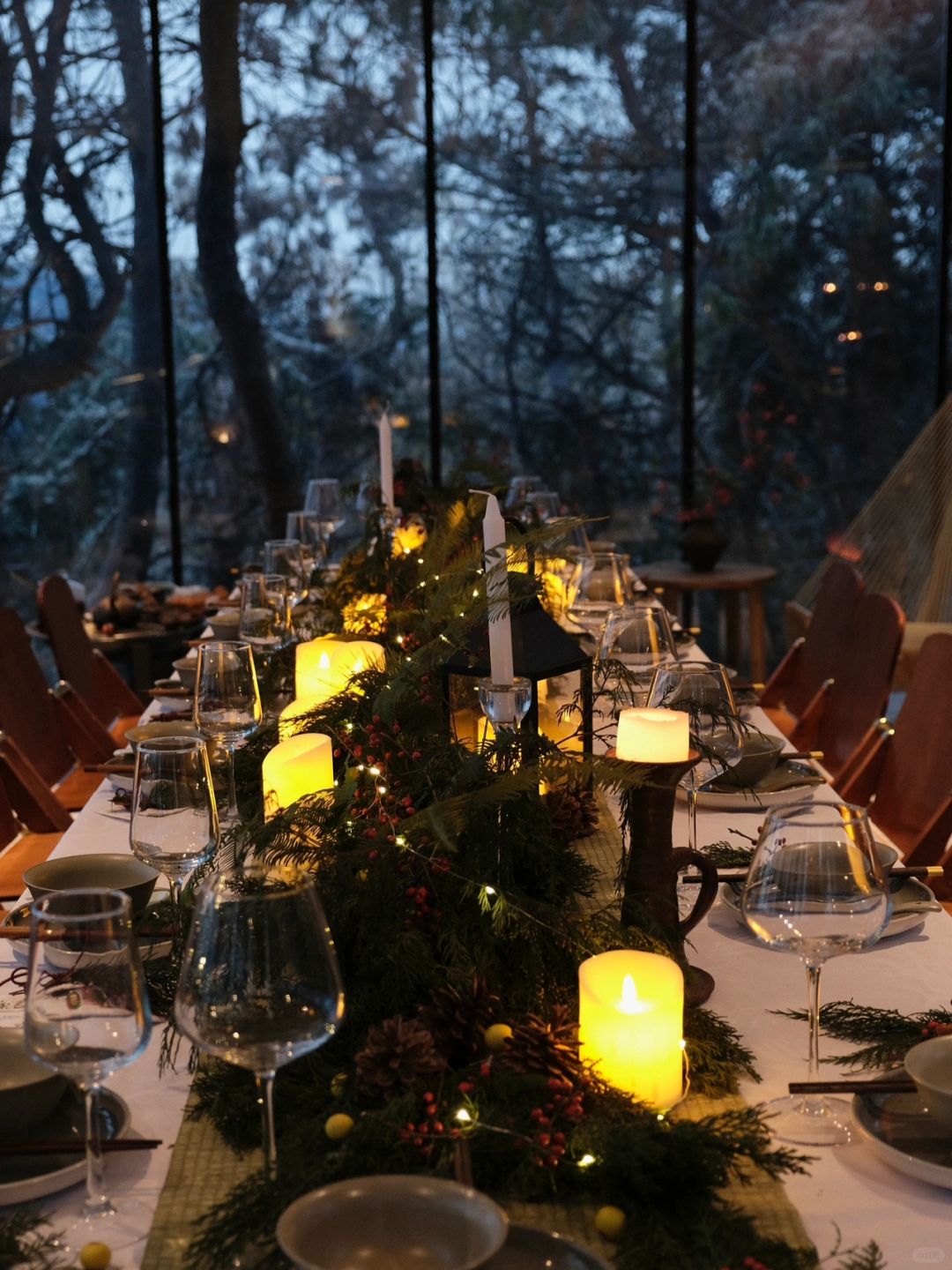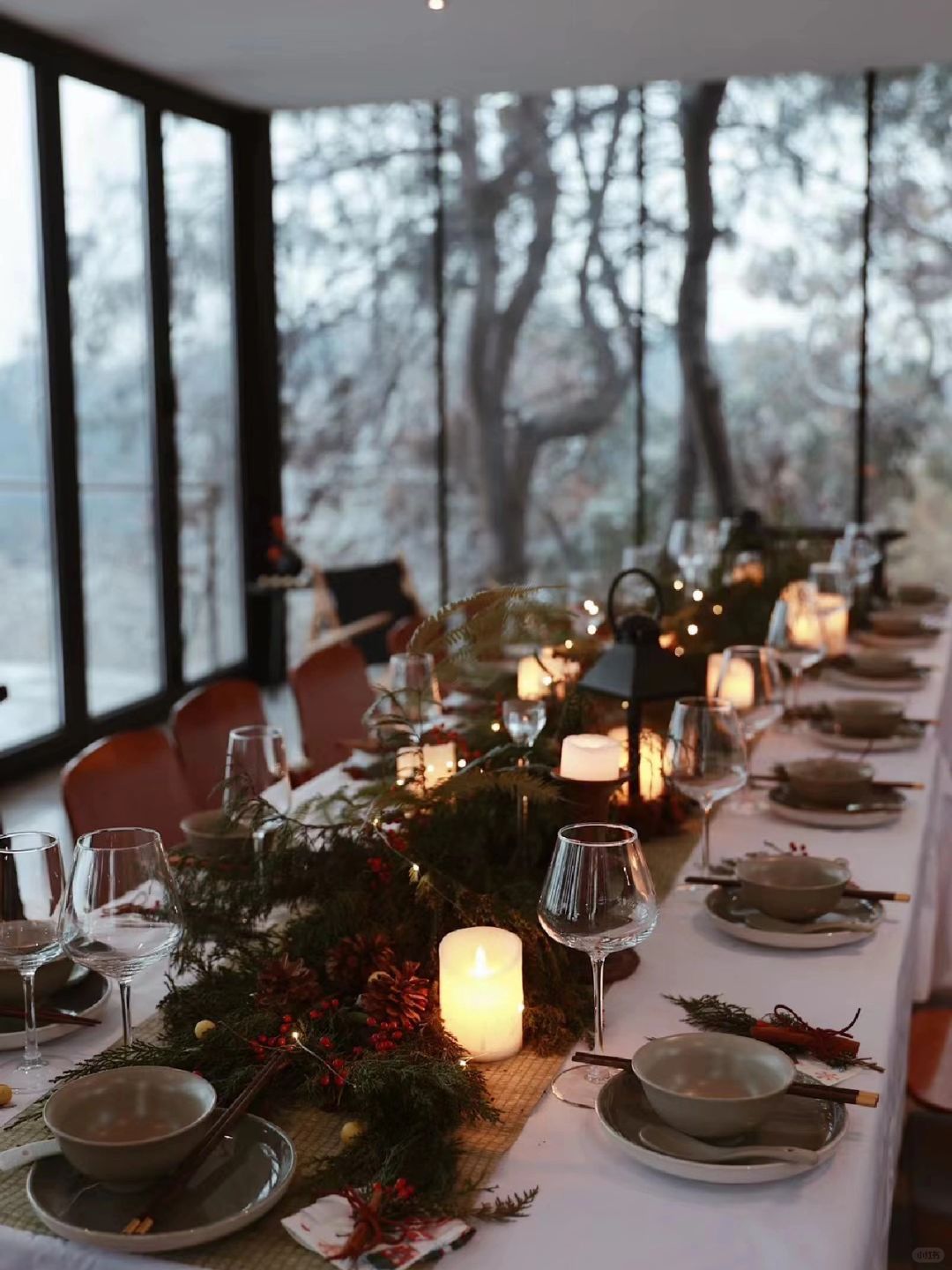 就在武汉 不在北欧 山里下雪了! 当一切节日、纪念日碰上下雪 就格外需要一场仪式去纪念 所以我们常说生活需要仪式感 不,或许不是生活需要 而是我们更需要 我们需要一个仪式 给拥抱一个理由 给见面一个理由 给穿上漂亮裙子一个理由 - 依旧在樾和林泉 我们在餐桌上铺上一层桌布 一顿森林晚宴就诞生了