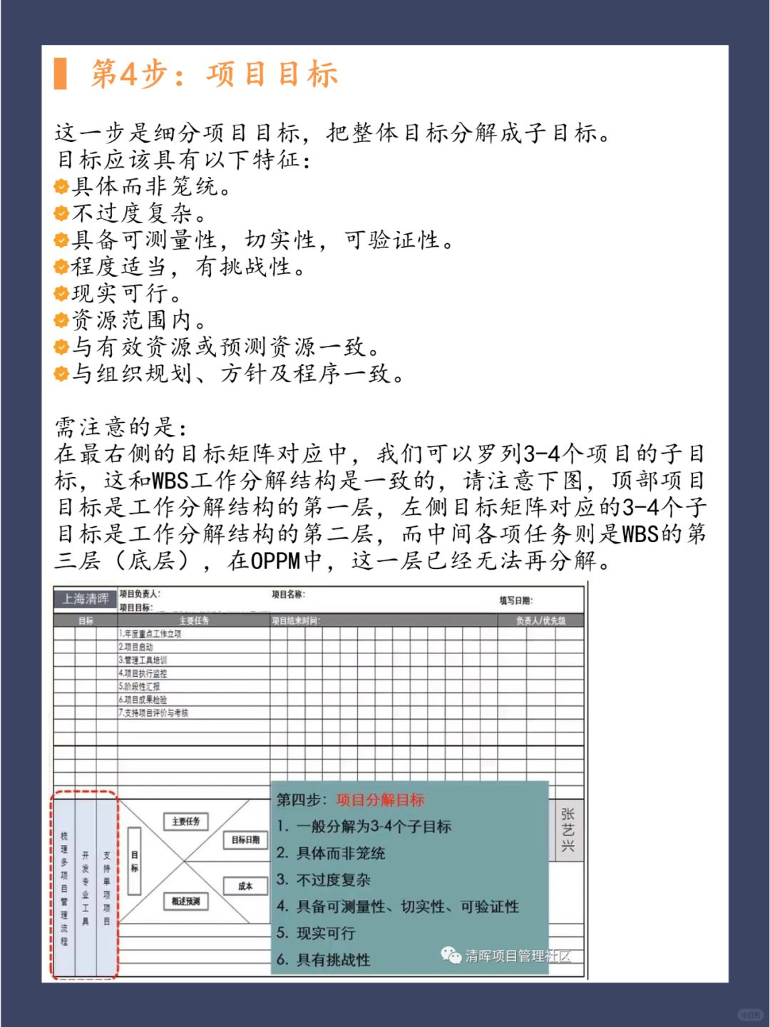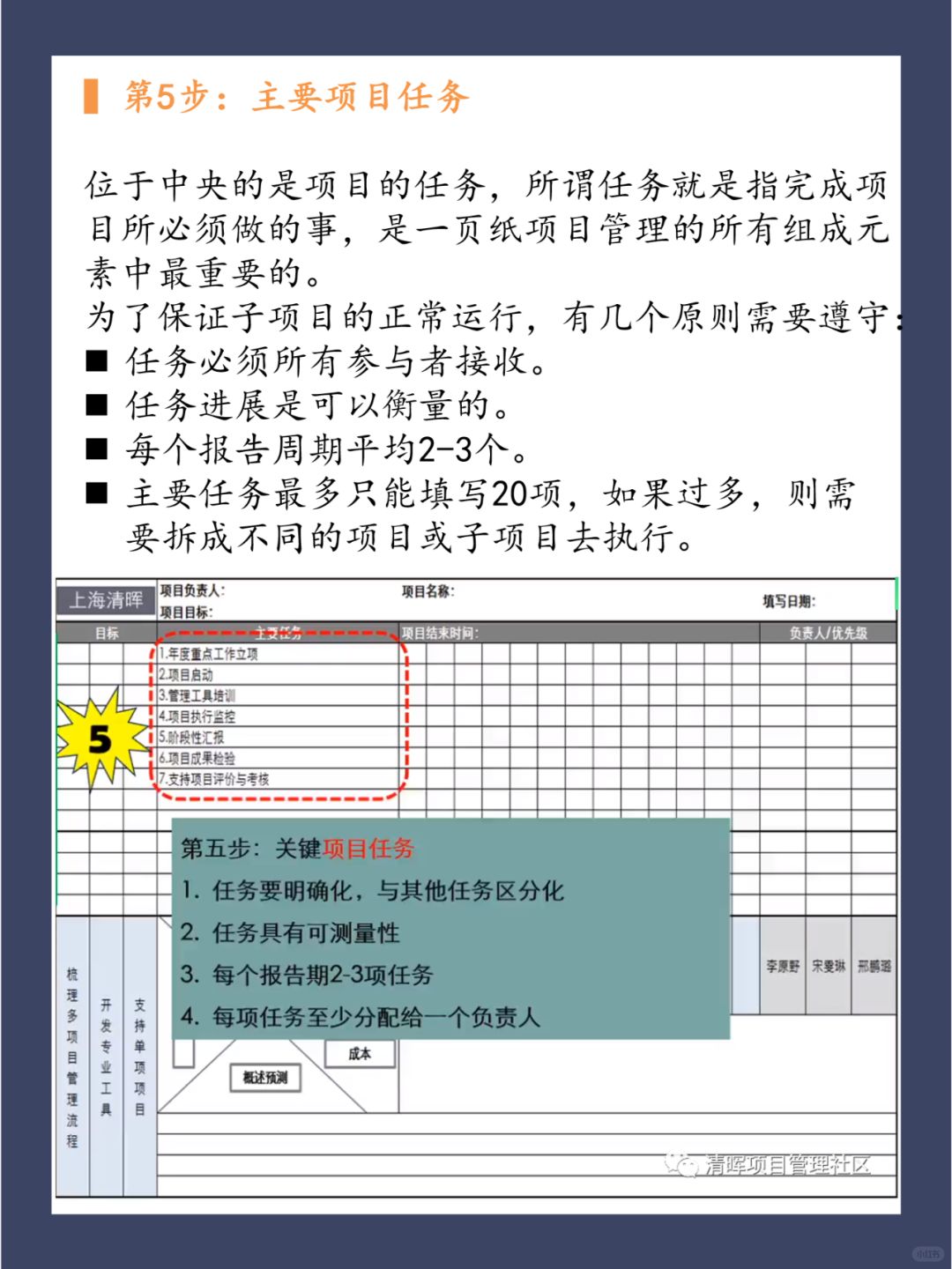 “一页纸项目管理”的图表结构囊括了一般项目管理的5⃣个部分: