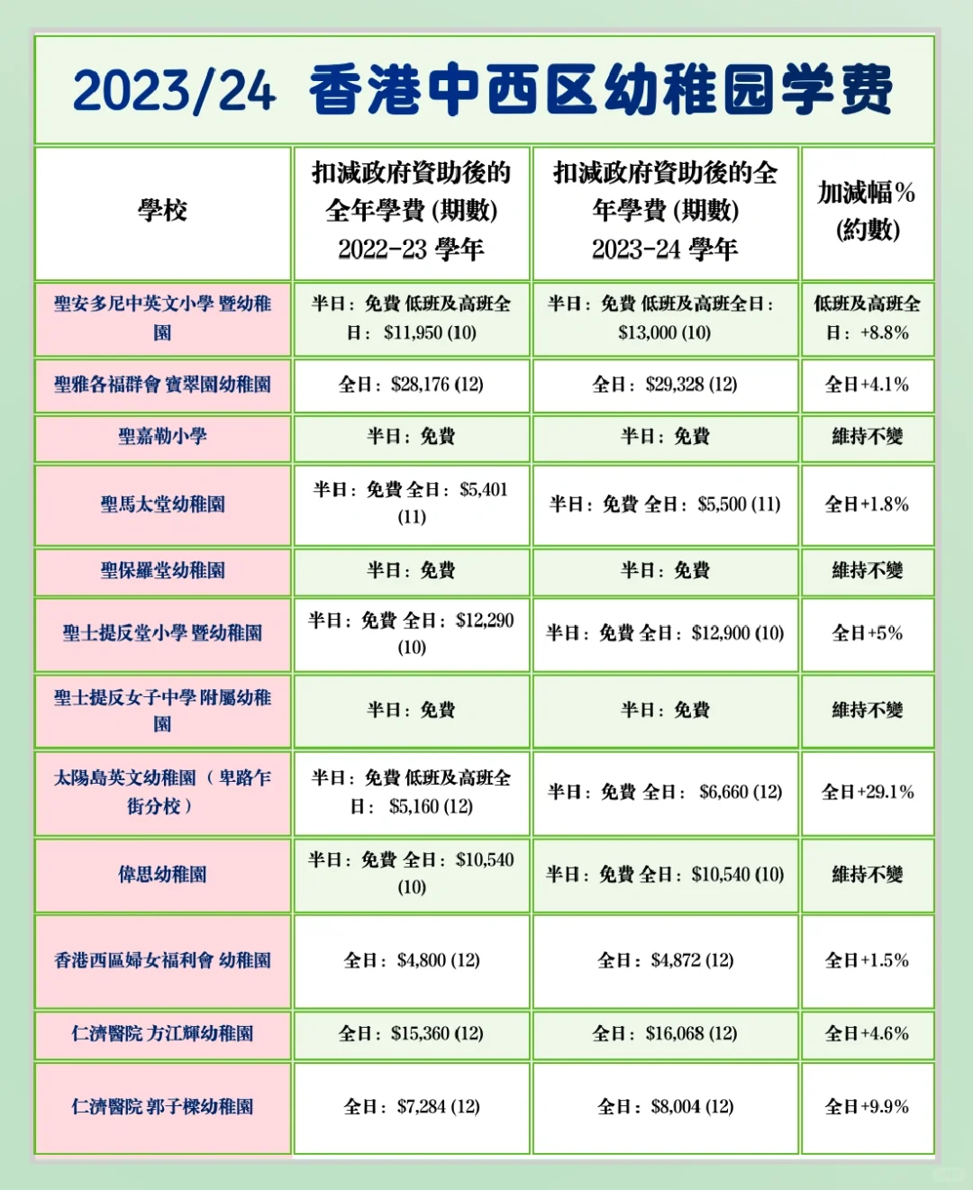 [哭惹R]而港岛区内数间一条龙学校的幼稚园亦不约而同增加学费,包括中西区的弘立幼稚园,半日班学费增加4.5%至$140,580;湾仔区的香港真光中学(幼稚园),半日班学费增加4%至$44,970,以及东区的苏浙小学校,半日班学费增幅由6.8至9.6%,蕞高达$78,400。