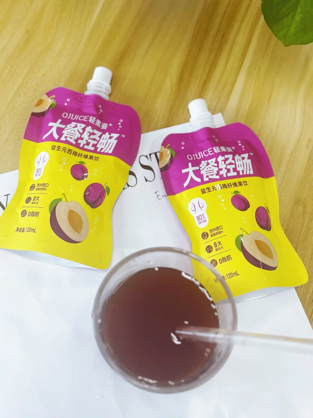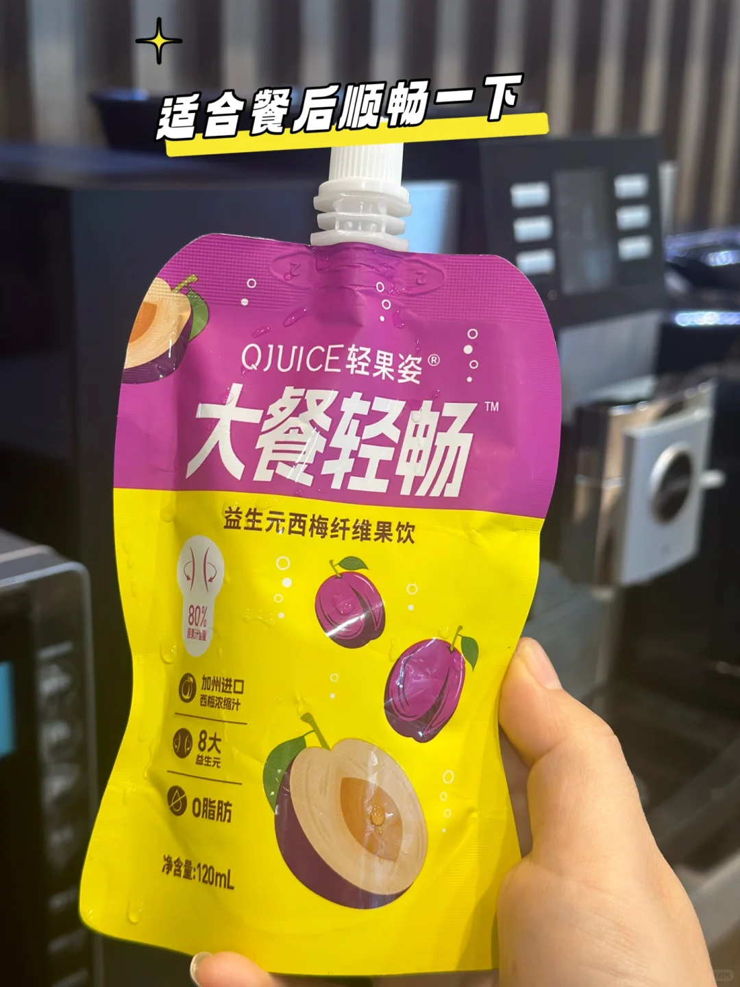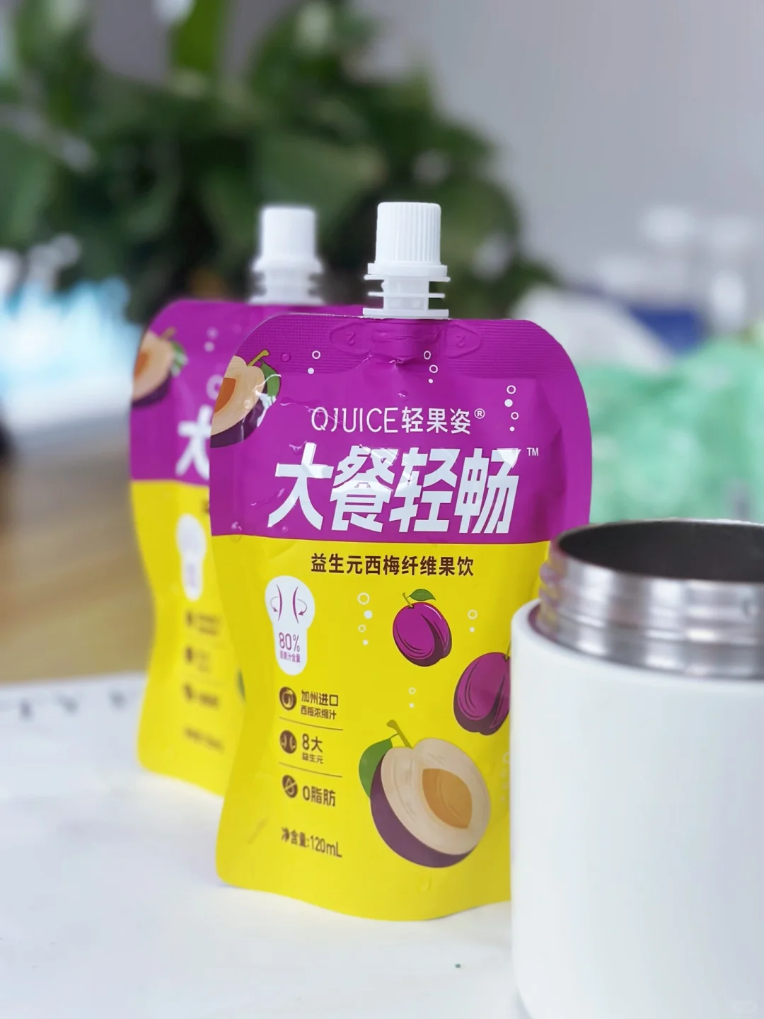 有时候中午在外面吃饭,不太可能随身携带养生食材,一般情况下会带上一袋轻果姿益生元西梅纤维果饮,它含80%原果汁,酸酸甜甜特别好喝,尤其是吃了肉食之后,喝一袋会感觉清爽了很多。
