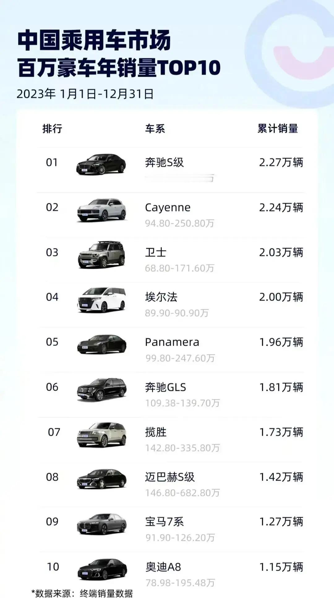 根据懂车帝的统计,2023年中国乘用车百万豪车年销量中销量最高的奔驰S级总销量为2.27万辆,仅4款车年销量超过2万,而且排名前五的豪华车型起步价都低于仰望U8,如卡宴、帕拉梅拉、卫士等起步价都在100万元以内。