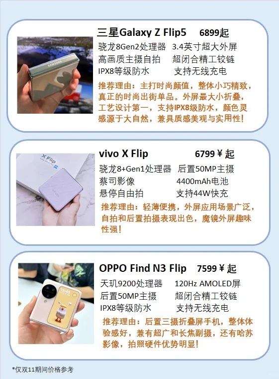 ☑️三星Galaxy Z Flip5:这款手机是外屏最大的小折叠,小巧便携;工艺设计第一,主打时尚颜值,整体小巧精致,是一款时尚出街单品。悬停自由拍摄,支持IPX8级防水,手机材料方面使用了回收和环保材料,对环境也非常友好~双十一现在入手还可以赠送一年碎屏险+价值999元蓝牙耳机,宝子们还不快加入购物车[购物车R][购物车R]