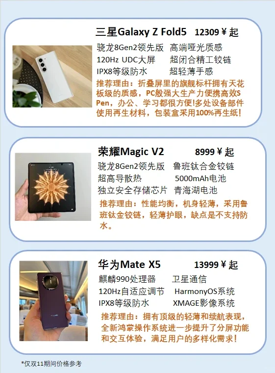 ☑️荣耀Magic V2:这款折叠屏性能均衡,机身轻薄,采用鲁班钛金铰链,轻薄护眼,缺点是不支持防水
