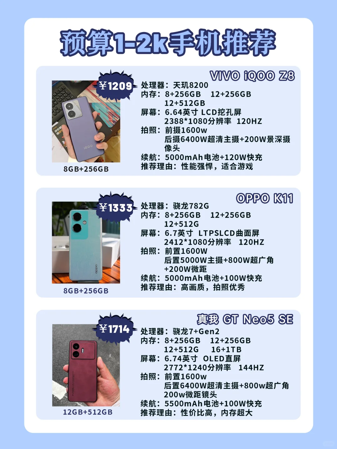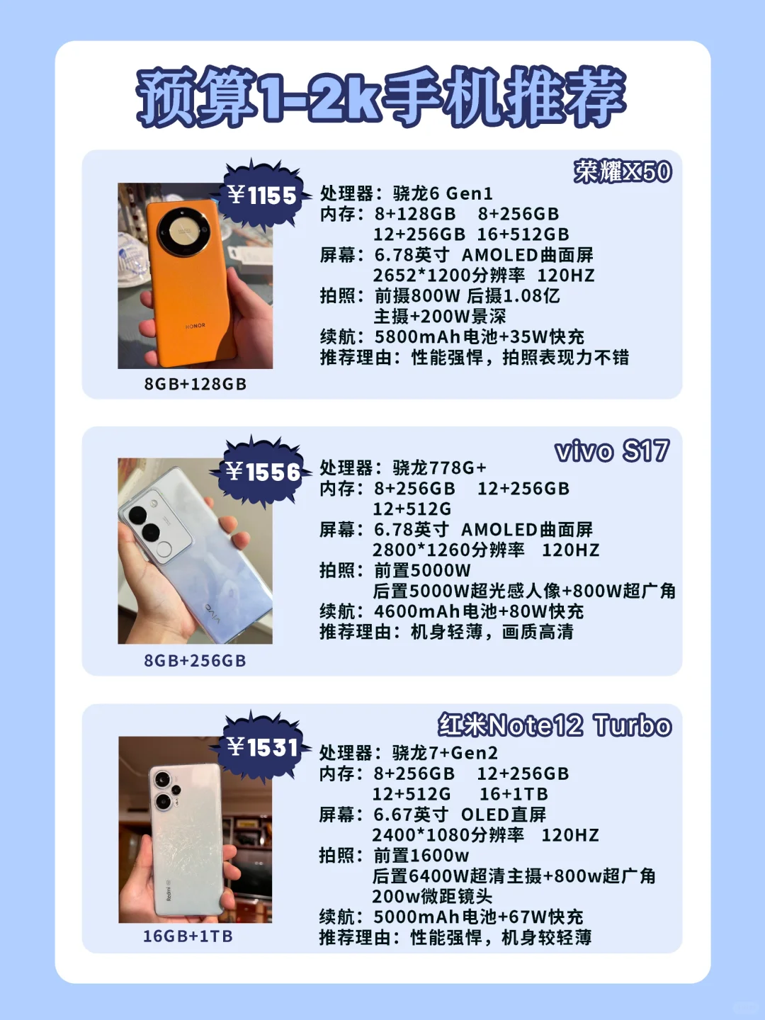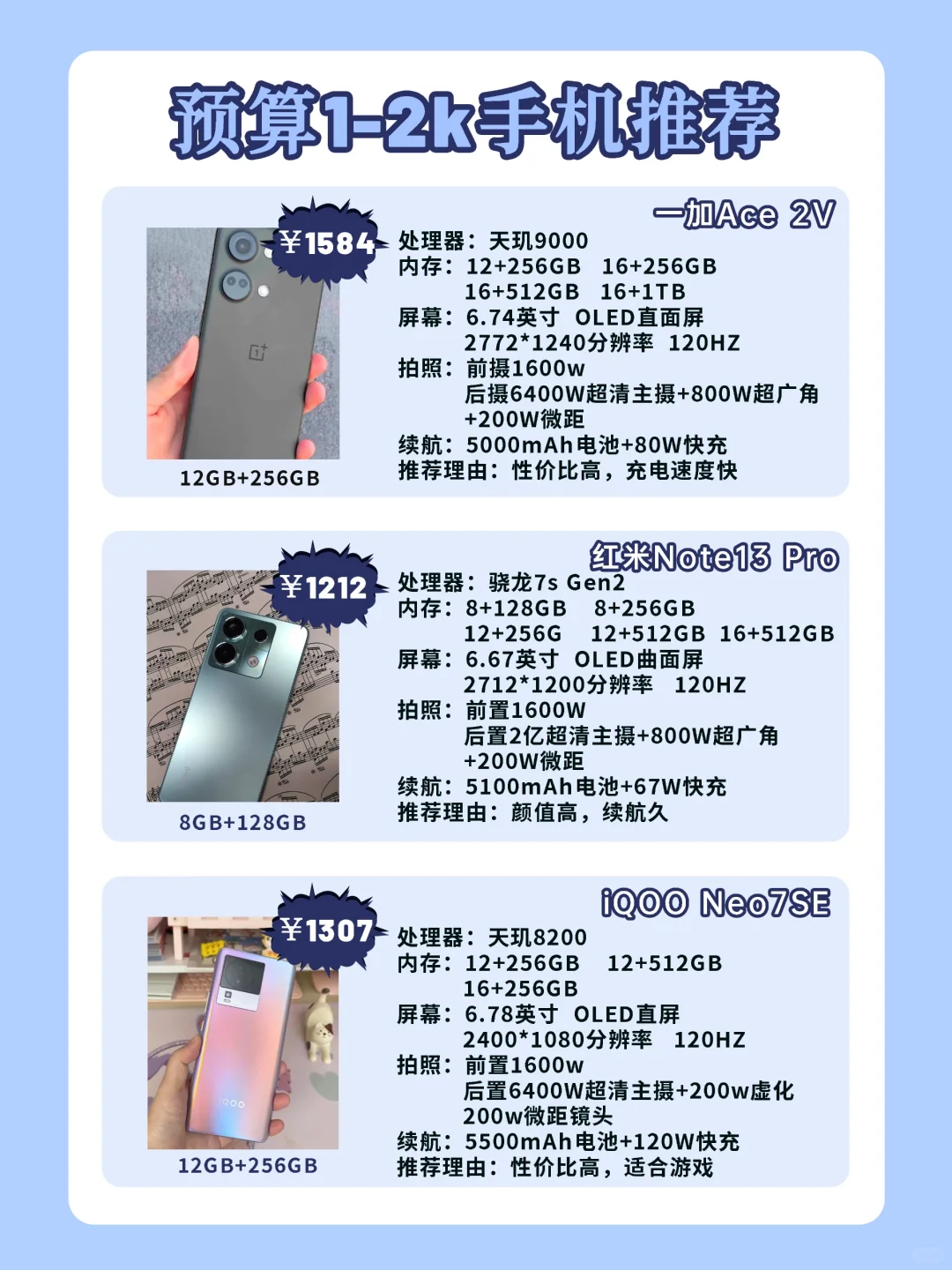 今天给大家推荐一篇预算在1-2k左右的高性价比手机,这边挑选了9款手机,它们是低价千元机中的佼佼者,兼顾性能和颜值,既可以用来送给父母做礼物🎁也可以作为学生党的备用机!