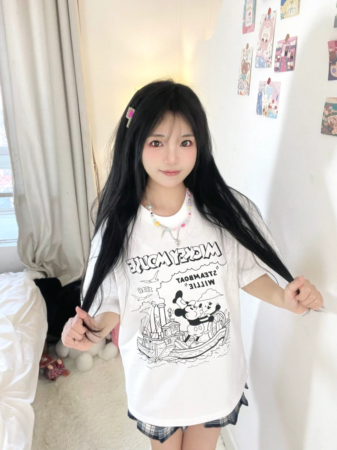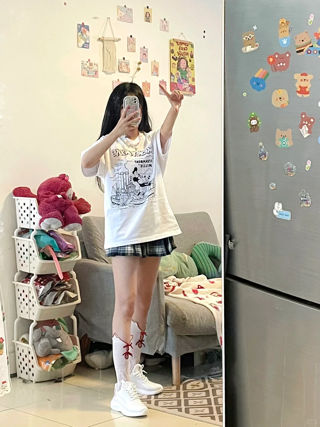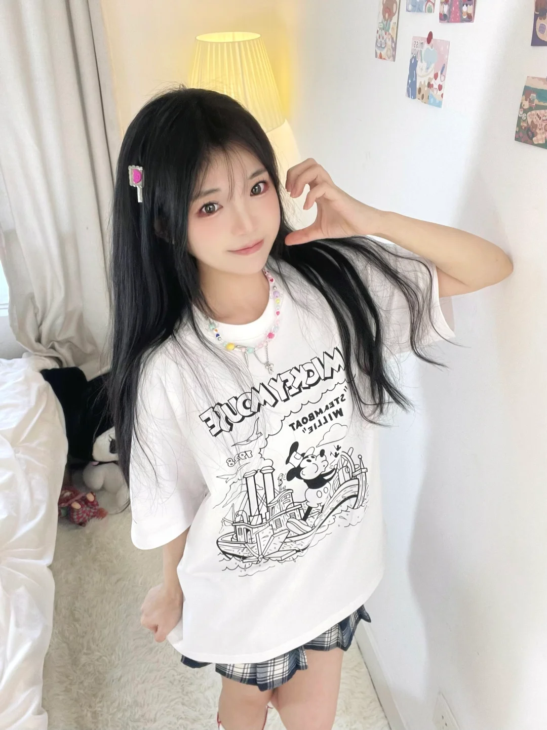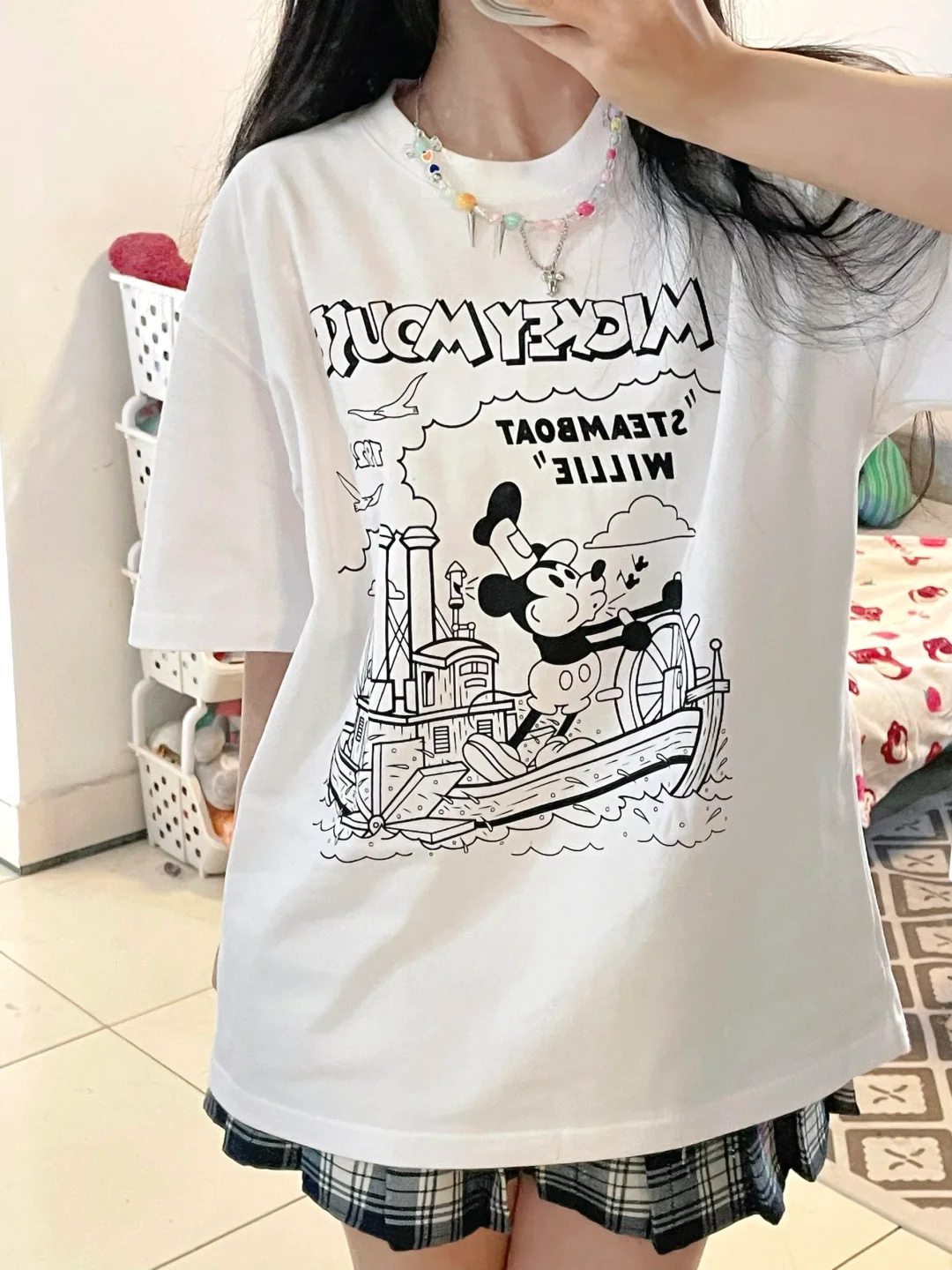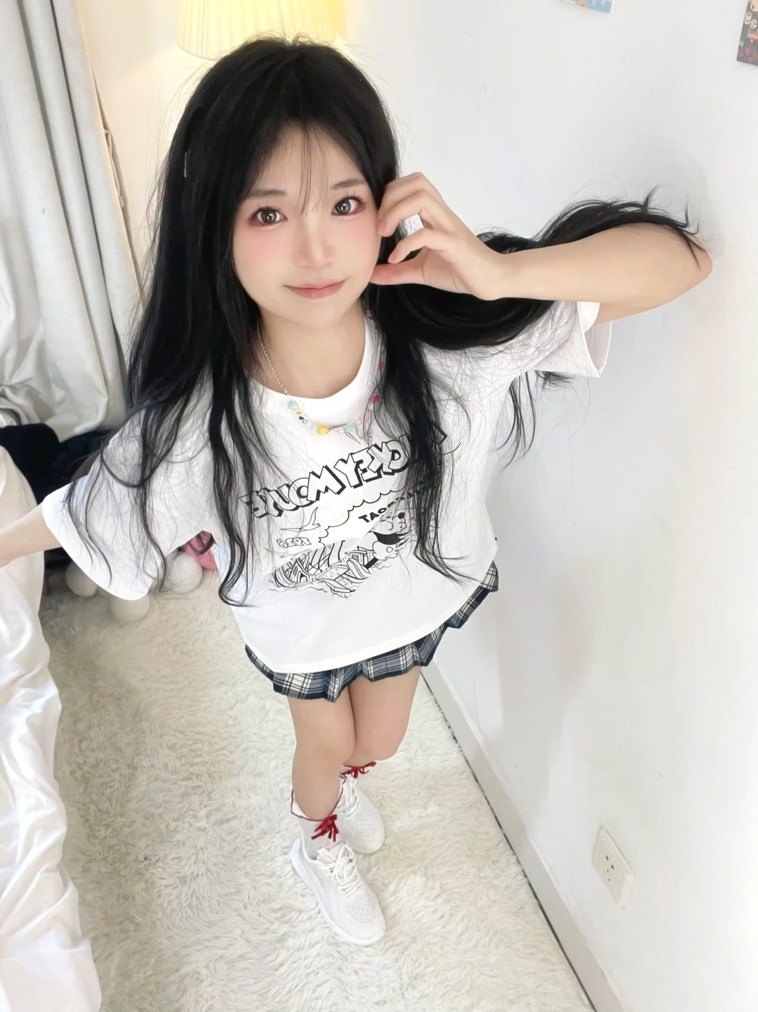 T恤搭格子裙好青春呀