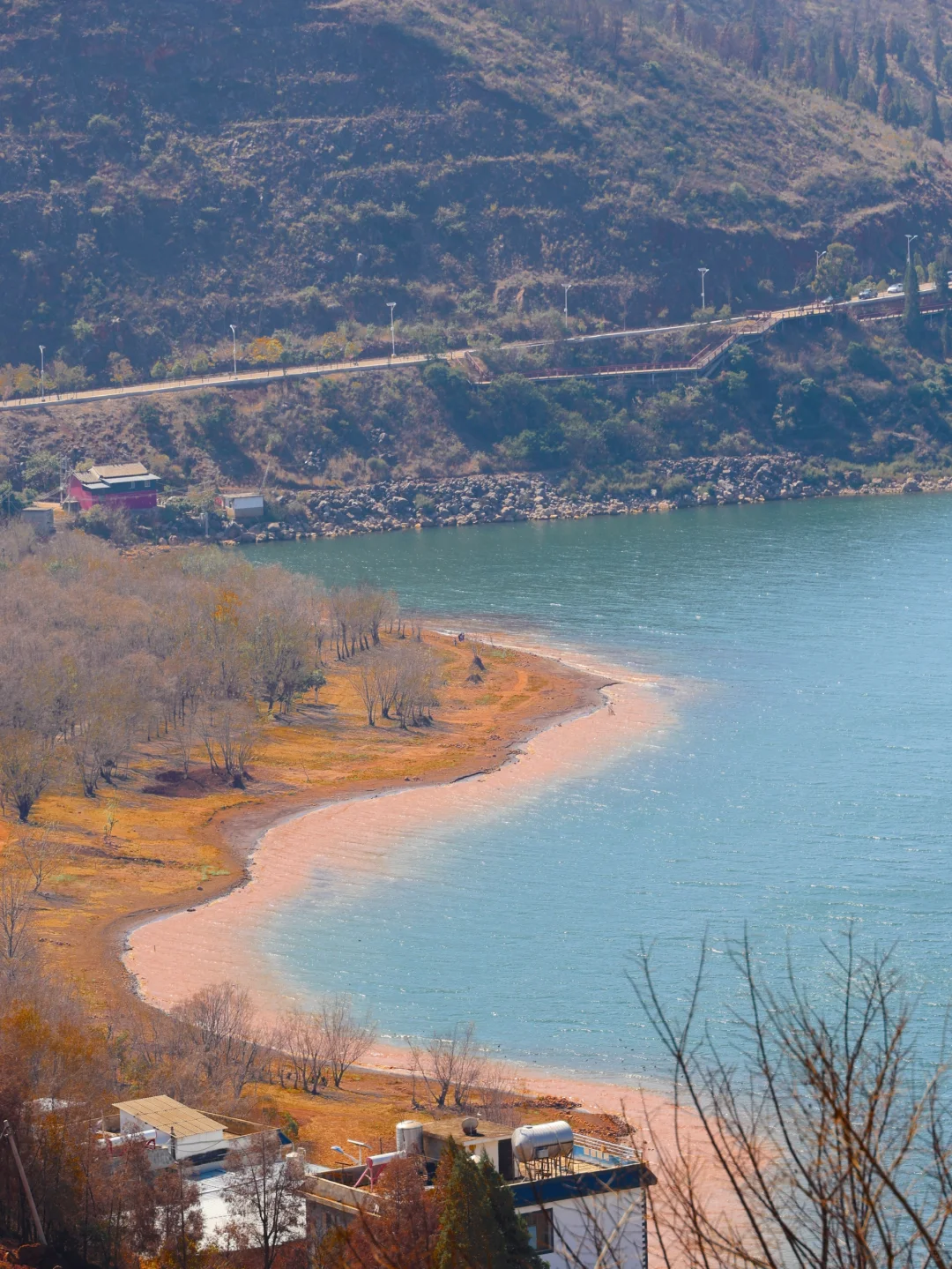 沿湖自驾回遇到很多湖边栈道,帆船基地,都可以停下来,我们还在路边发现了另外一个红沙滩,从太阳小镇出来,往樱花谷方向,大概1公里就能发现。