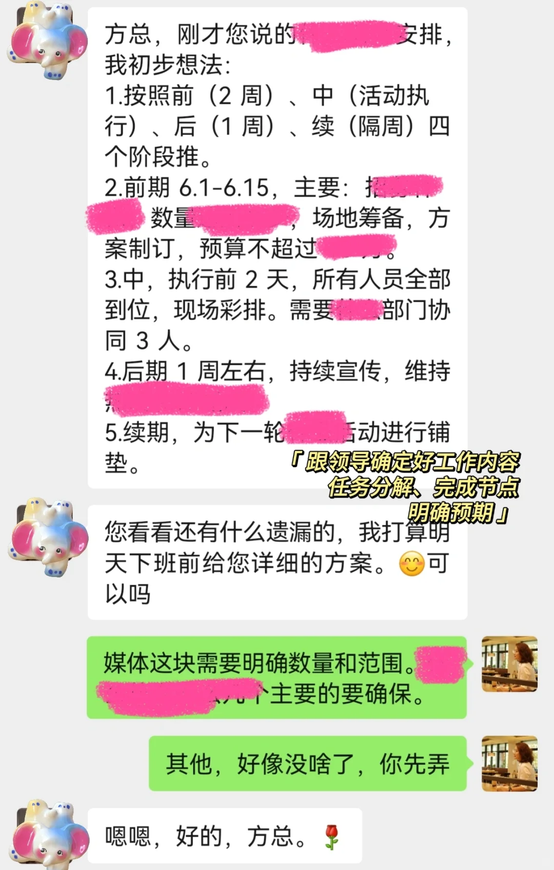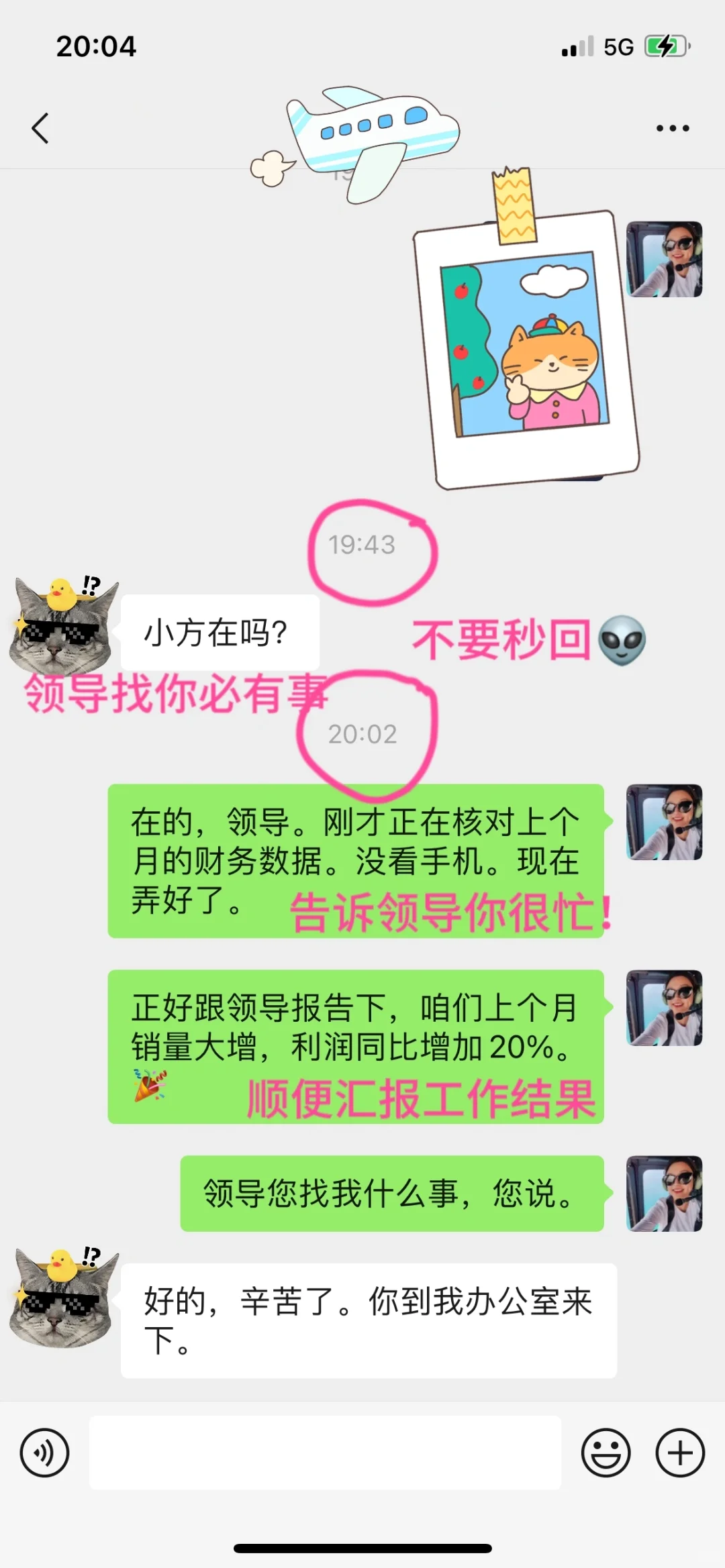 🔸有效汇报,及时沟通。很多人接到任务就干,完成前不敢跟领导汇报。其实,在工作过程中及时、主动向领导反馈你遇到的问题和事情的进展非常重要❗️
