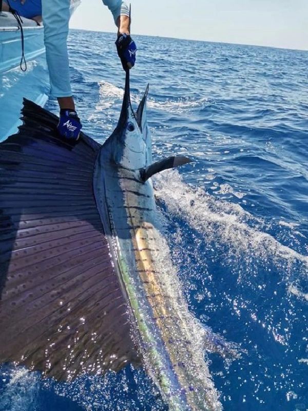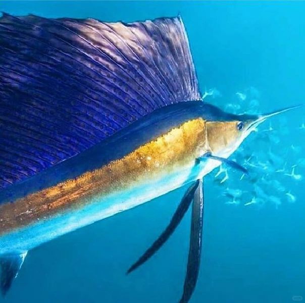 🍀形态特征:旗鱼形体巨大,一般长两米至五米,体形延长而稍为侧扁。身披细鳞,青褐色的鱼体上,有灰白色的圆斑。嘴的上颌如一把锋利的长剑,十分突出,背上有黑色斑点的第一脊鳍超过体高,其中部竟高鱼体一倍左右,像一面飘展着的旗帜,所以人们称之为旗鱼。