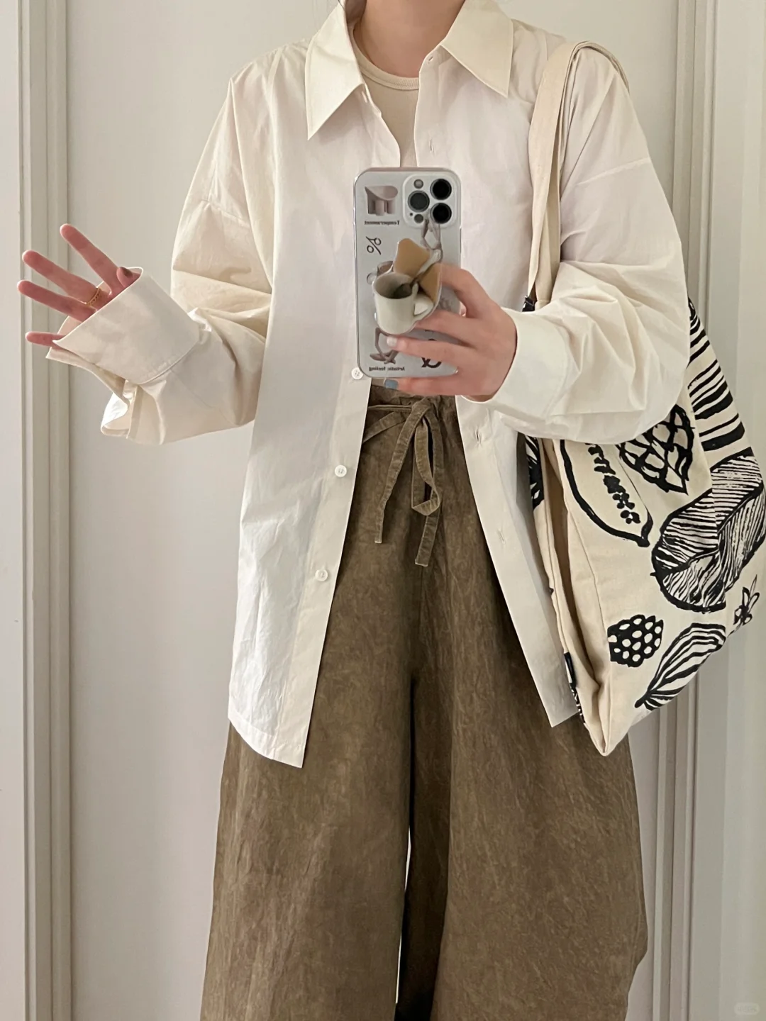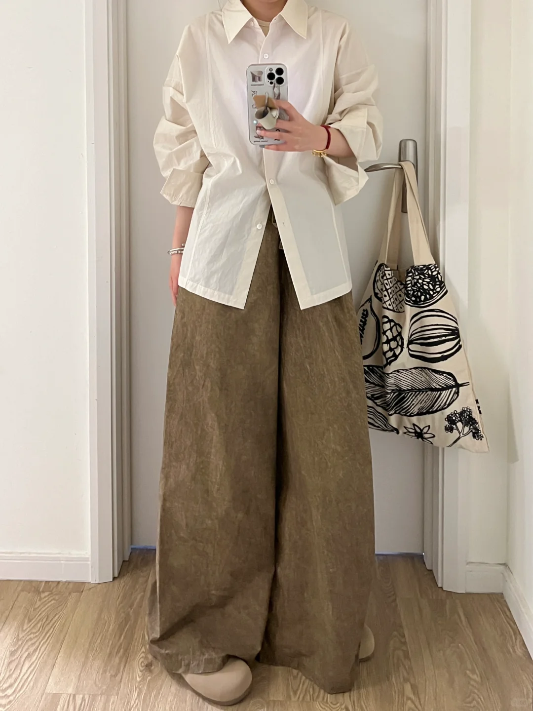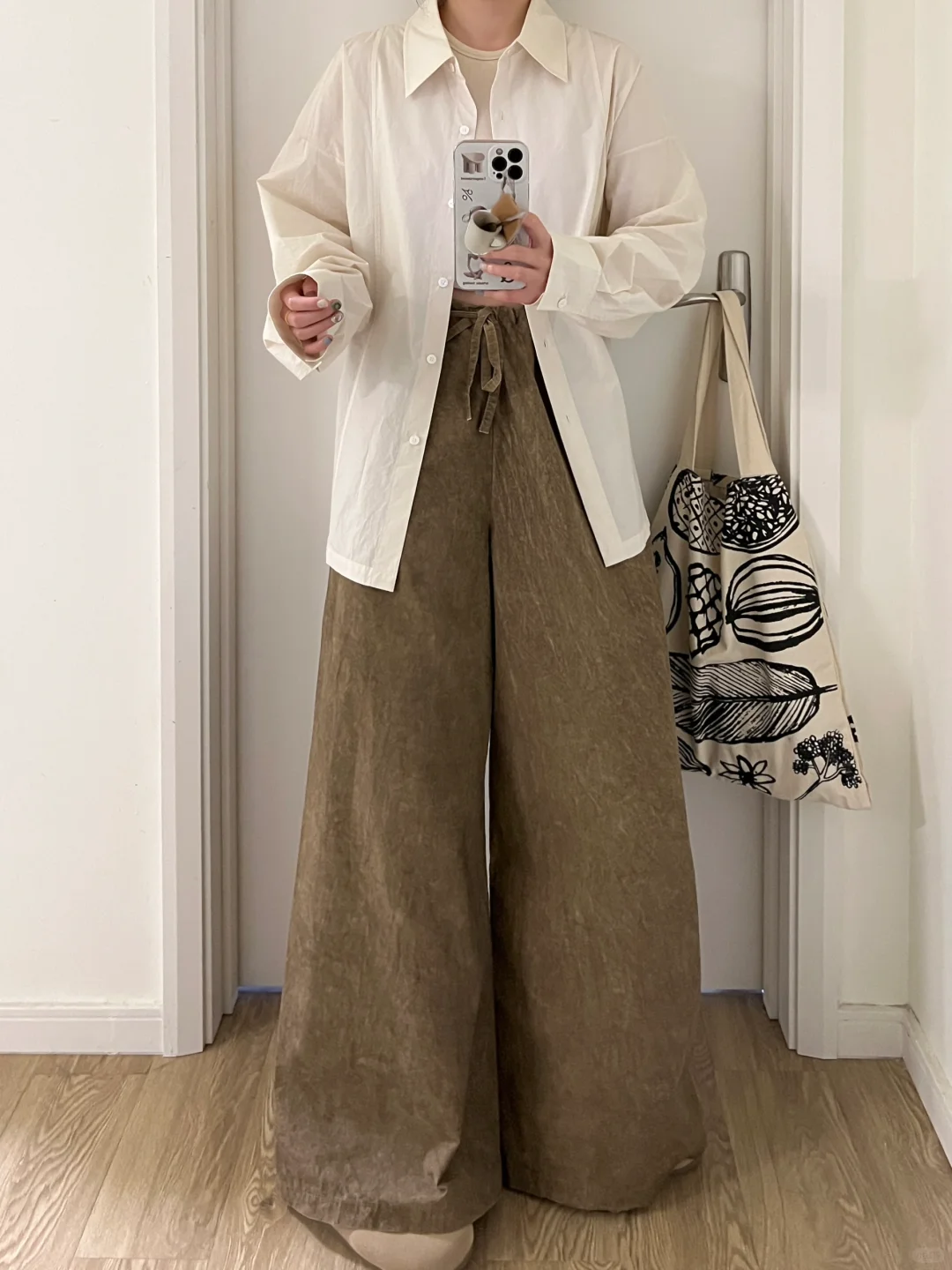 春夏极简慵懒|简约杏白衬衫+咖色棉麻阔腿裤