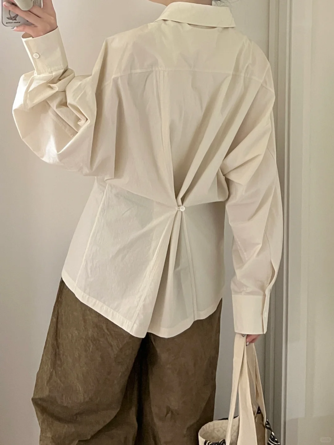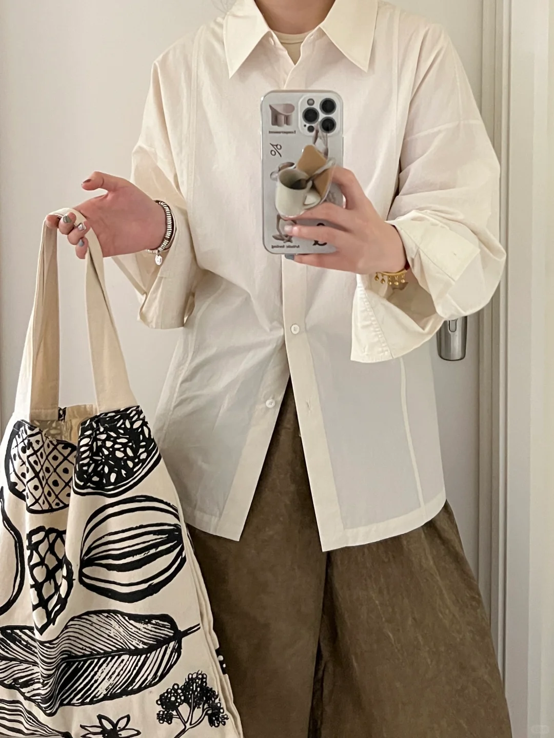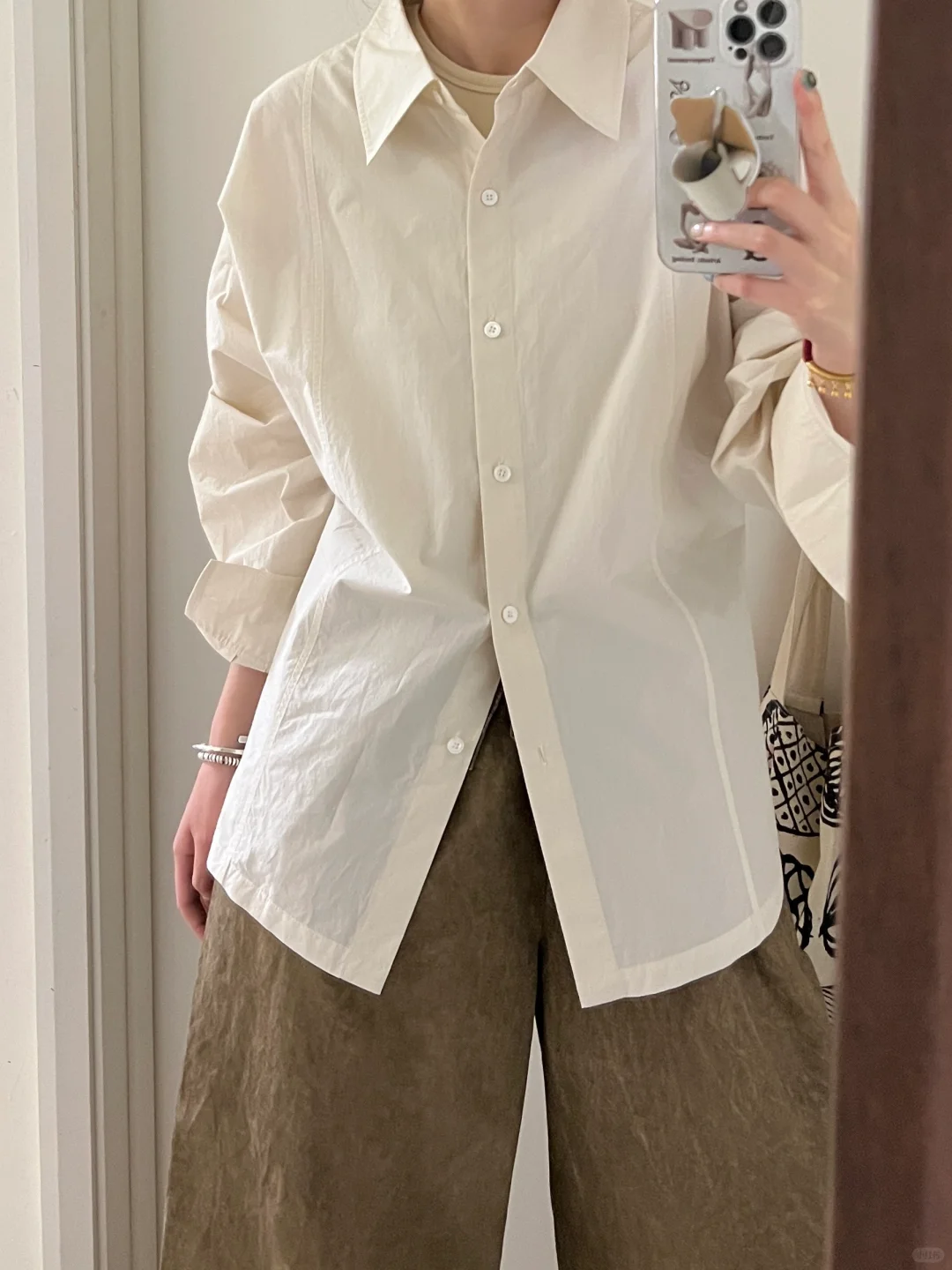 春夏极简慵懒|简约杏白衬衫+咖色棉麻阔腿裤