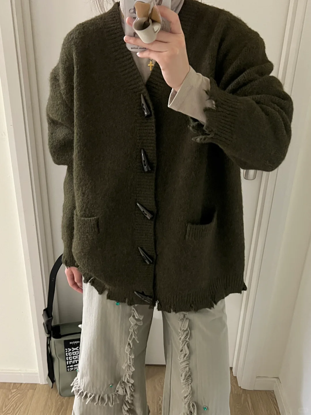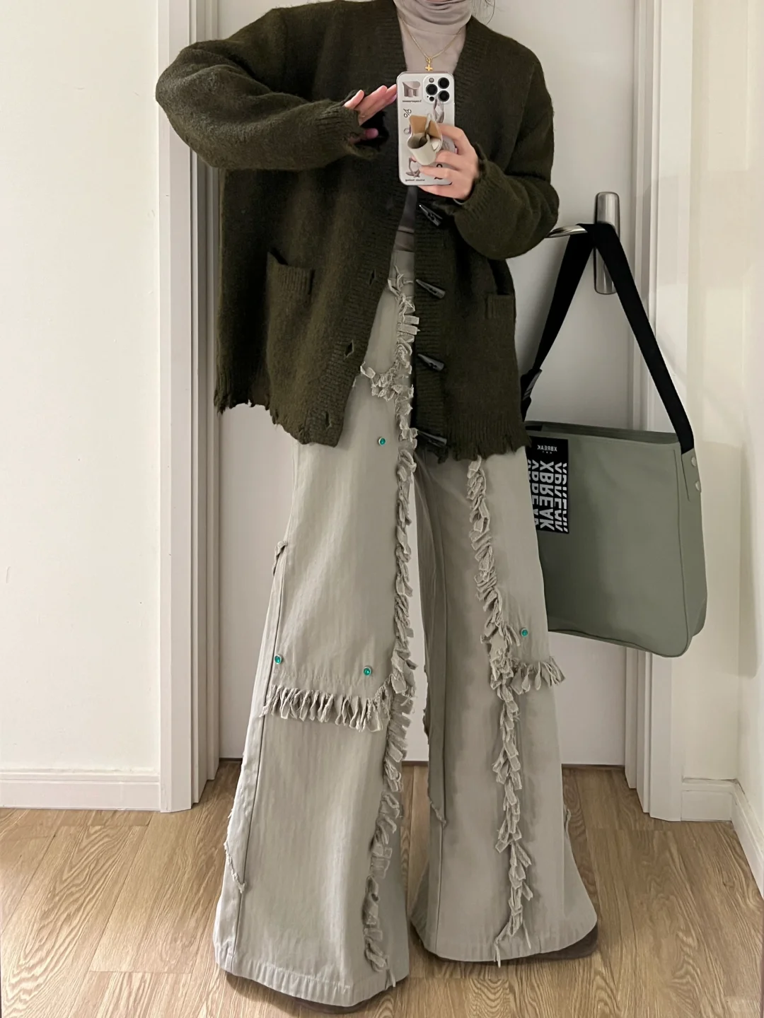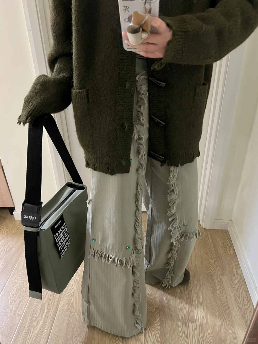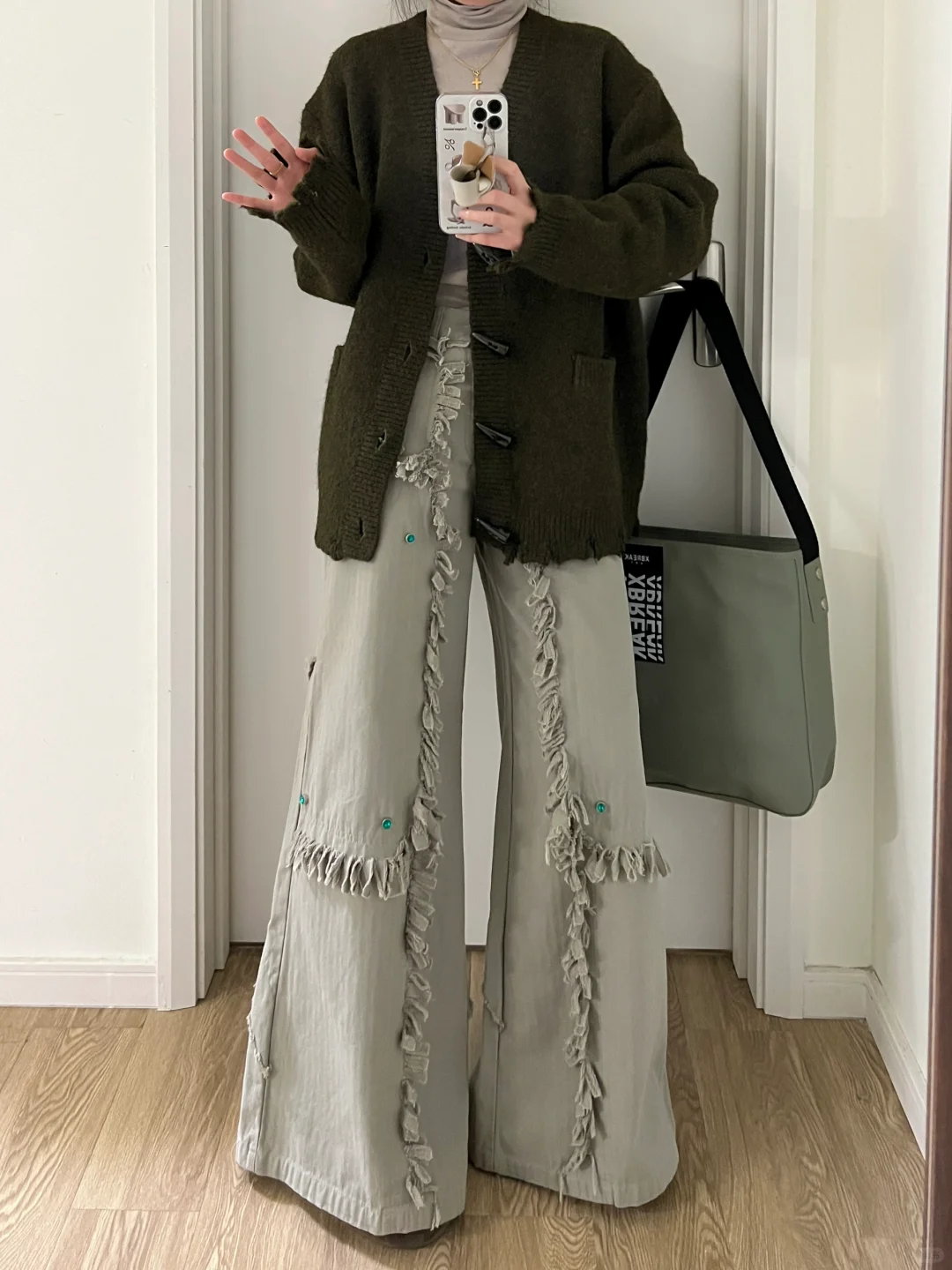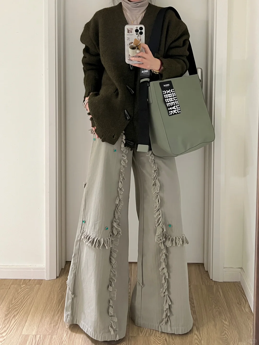 早春韩系复古慵懒|墨绿开衫毛衣+灰绿阔腿裤