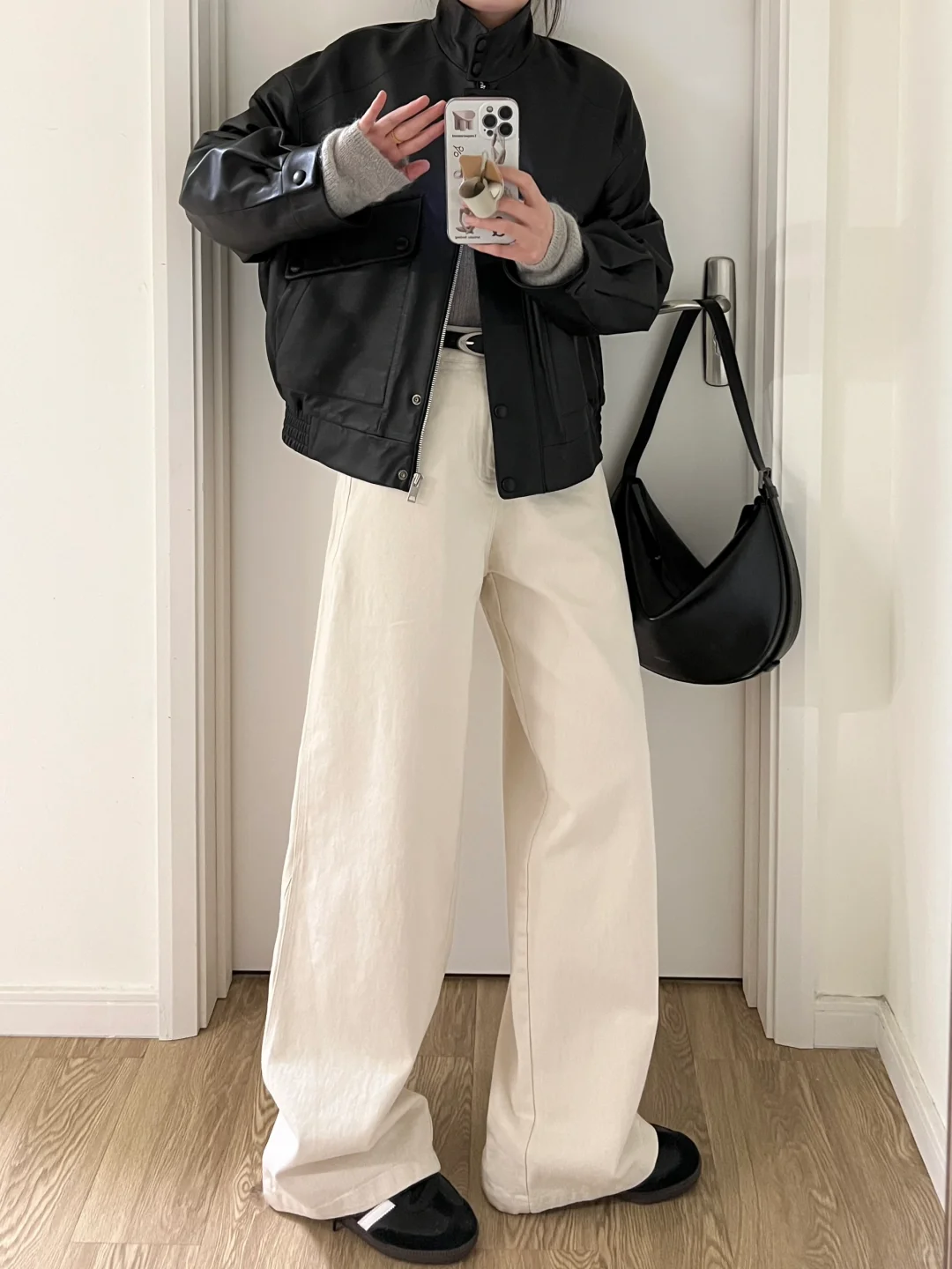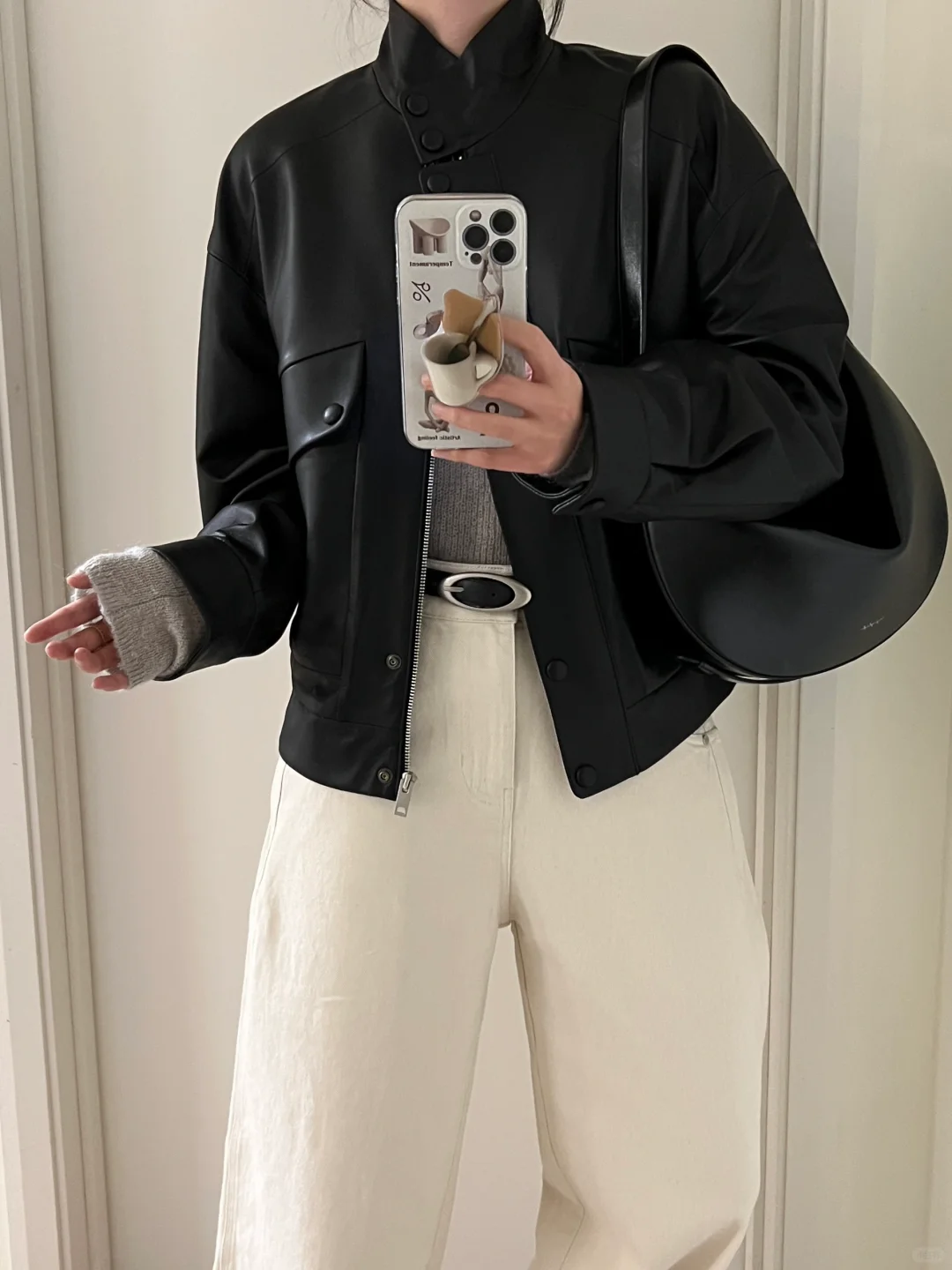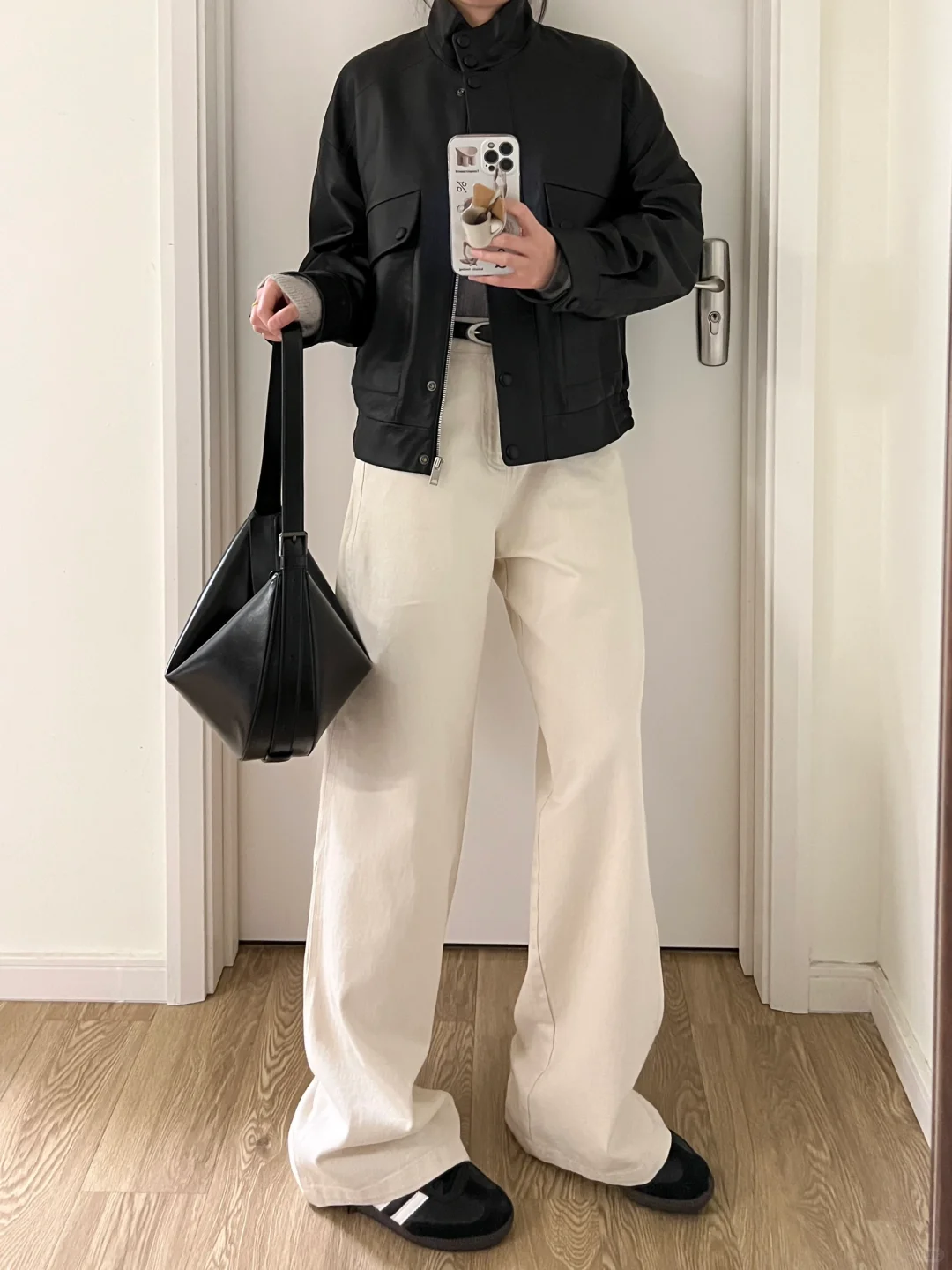 早春韩系酷飒|通勤立领黑皮衣+米杏牛仔裤