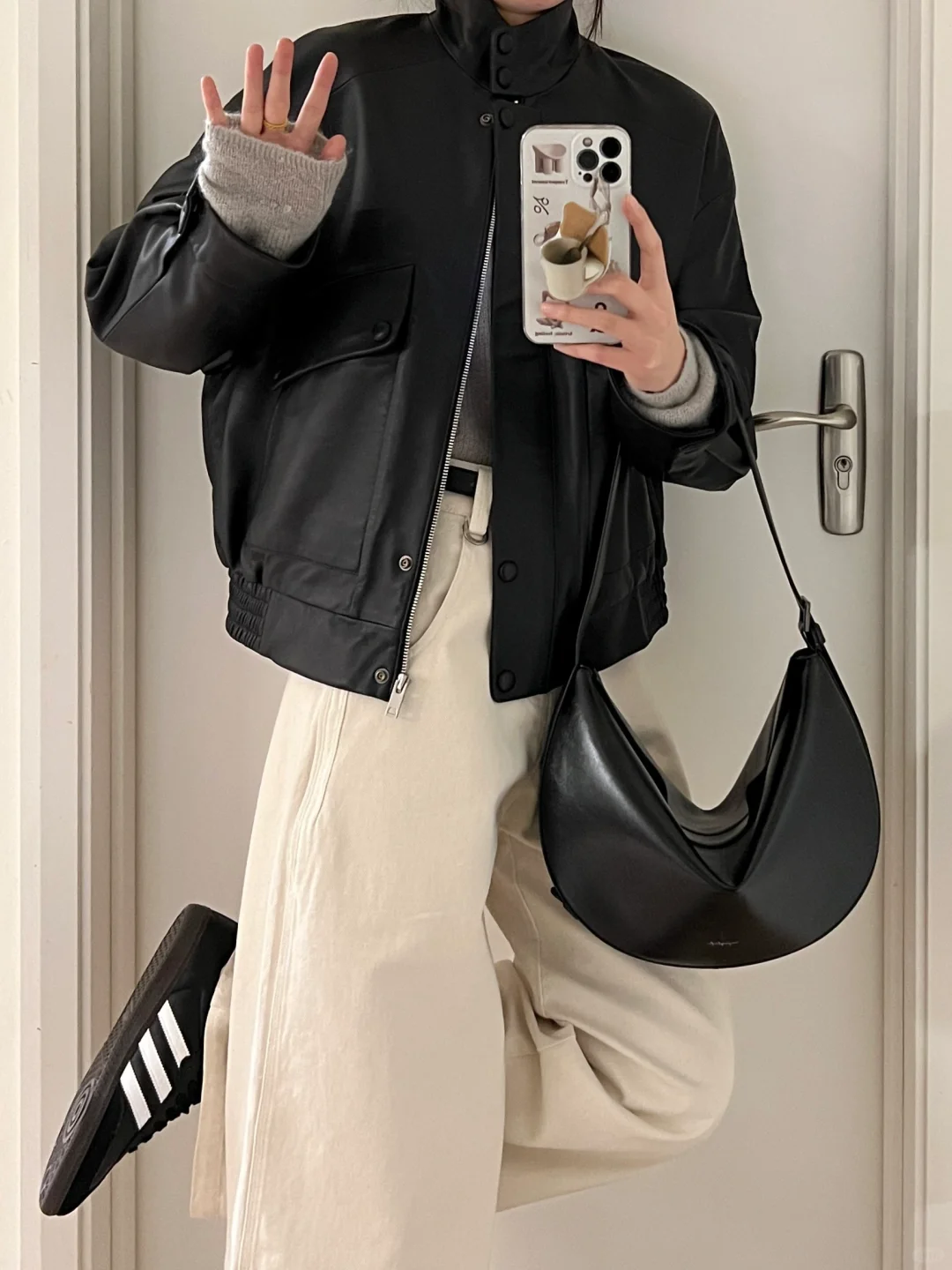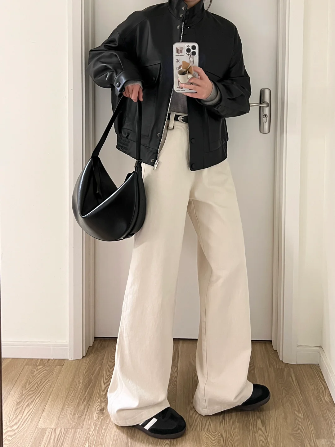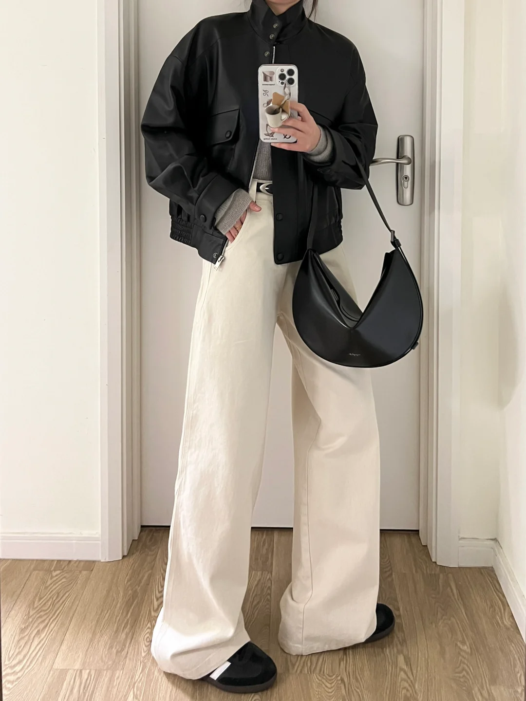 早春韩系酷飒|通勤立领黑皮衣+米杏牛仔裤