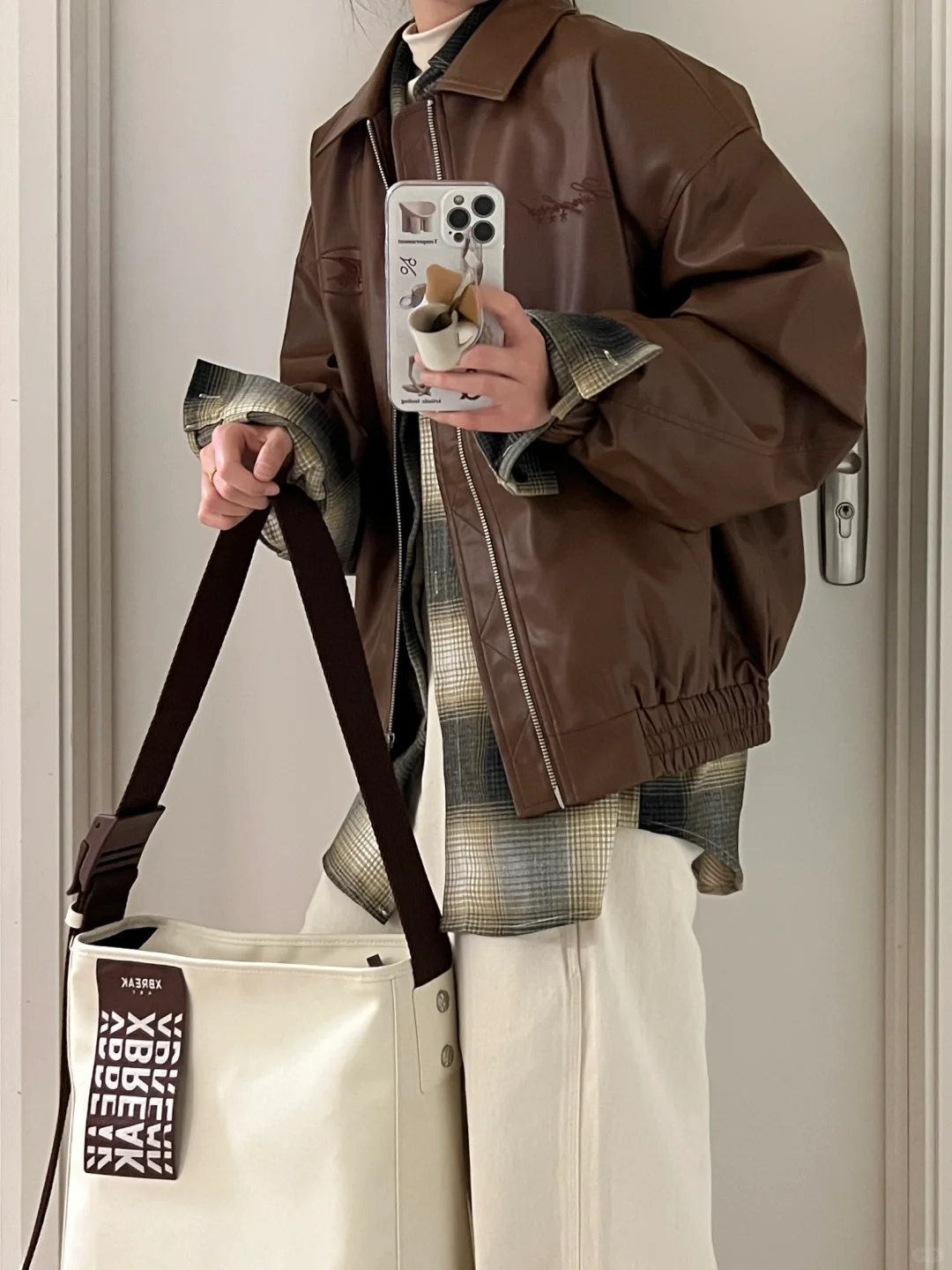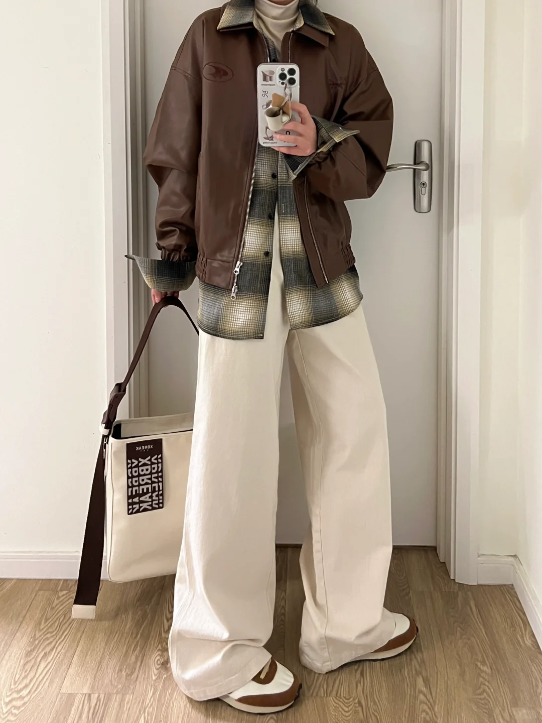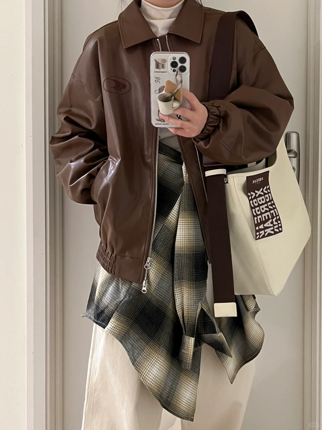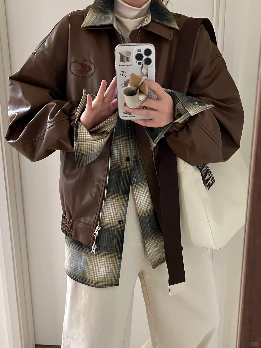 笔记灵感 早春穿搭 复古穿搭 皮衣 咖色皮衣 休闲穿搭 外套 衬衫 衬衫控