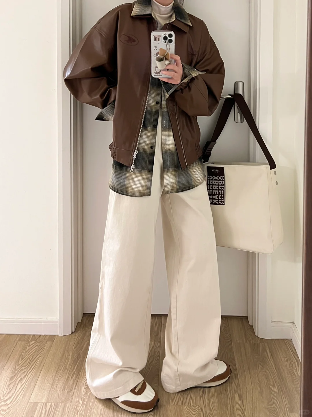 早春韩系复古|焦糖棕咖皮衣+格纹衬衫+米杏