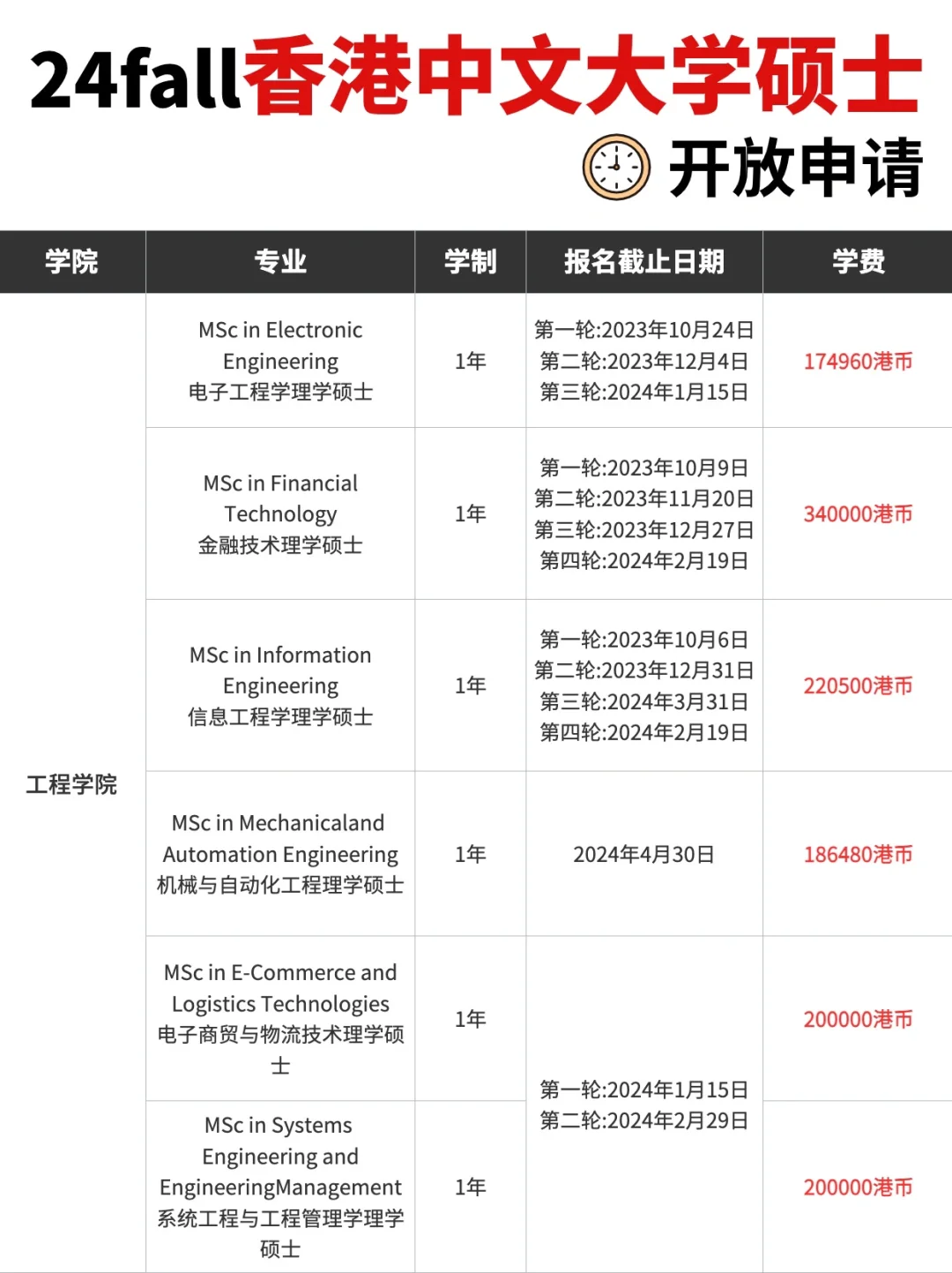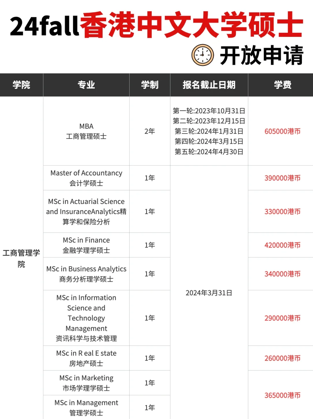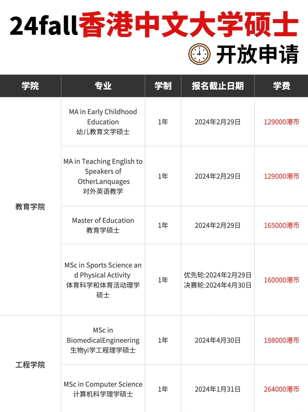 香港中文大学2024年秋季入学硕士项目的网申通道已经开放📩 ,今天为大家整理并汇总了各学院专业的申请截止时间和学费信息👋 👋