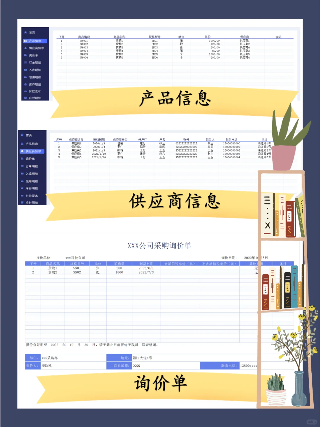 如何进行完美的采购管理? 那就事自己动手用Excel表格做一个采购管理系统 采购管理系统里面涵盖一下内容: 1、产品信息 2、供应商信息 3、询价单 4、订单明细 5、入库明细 6、领用明细 7、库存明细 8、付款流水 9、应付明细 10、等等 该系统下载后根据自己的实际情况调整修改即用 有需要的宝子们,厚台call师兄