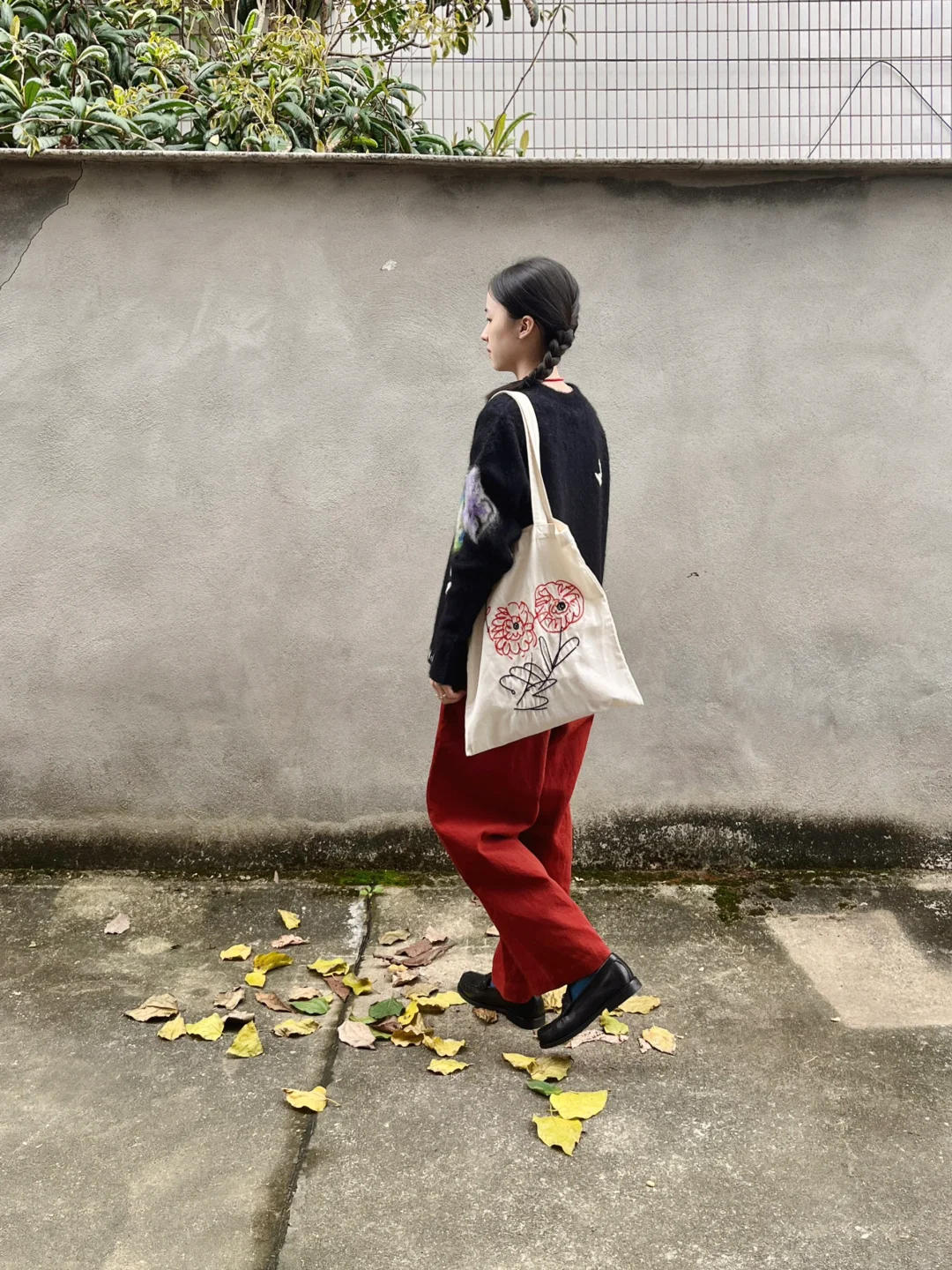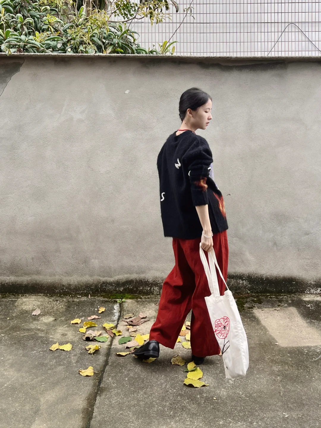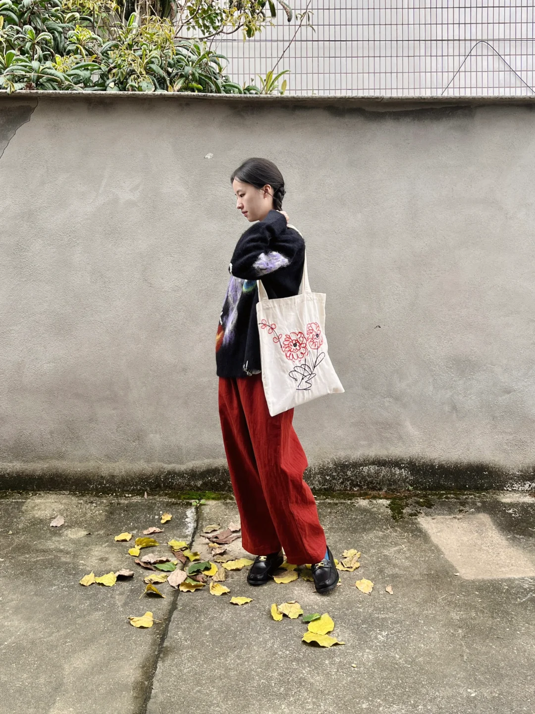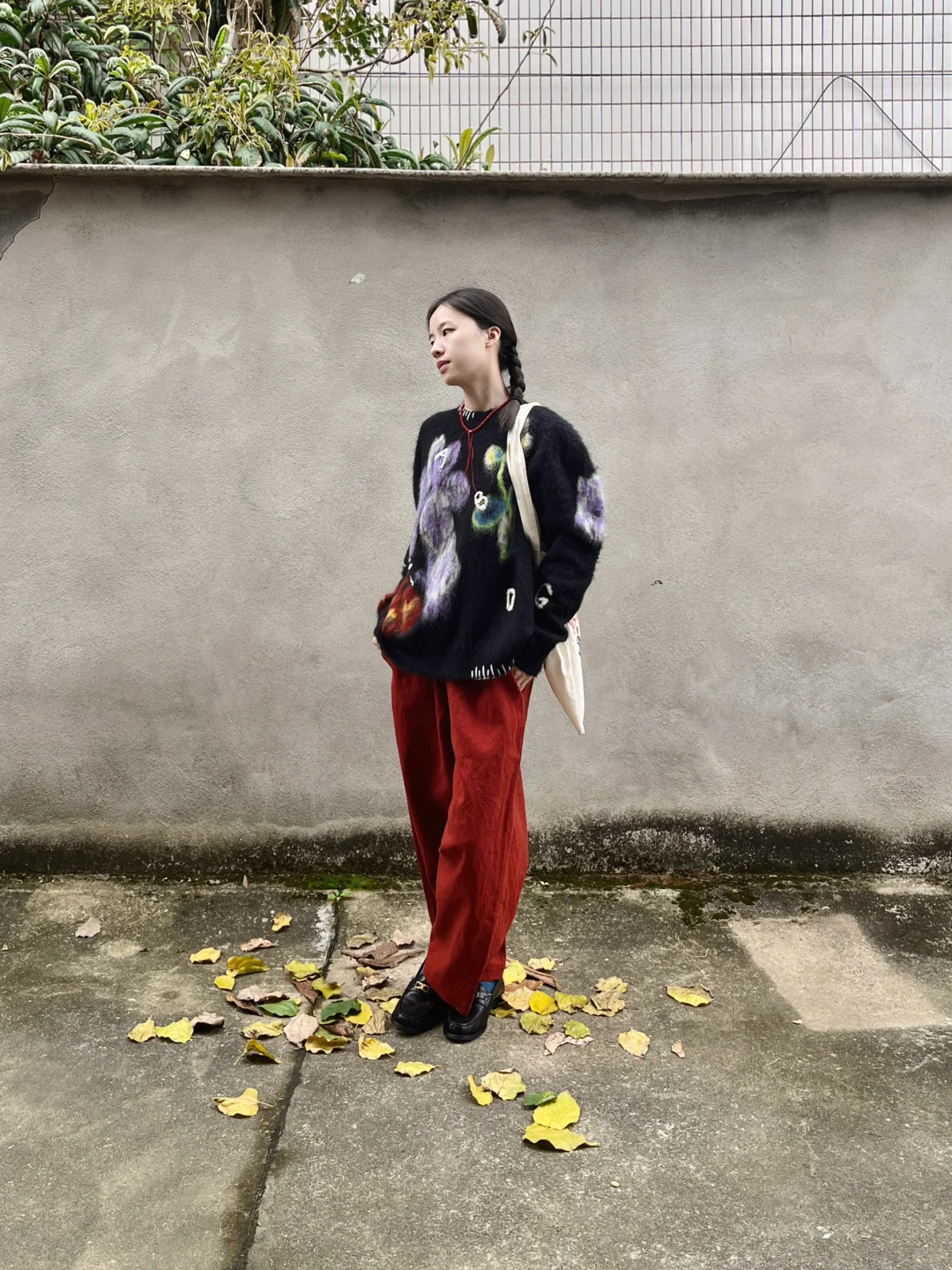 优雅东方韵,浅蓝上衣配米色长裤,漫步古风庭院,尽显时尚与古典的完美融合。