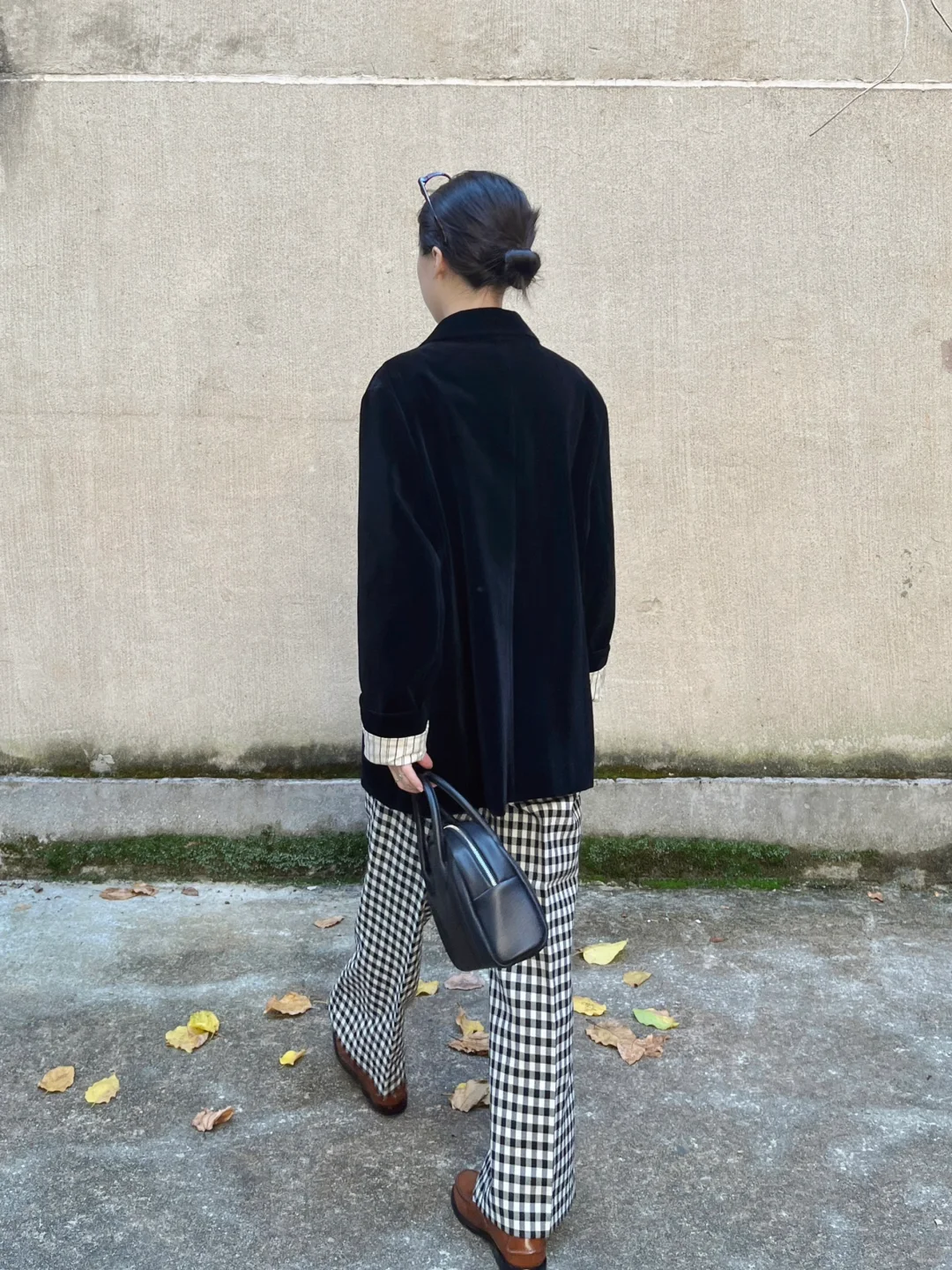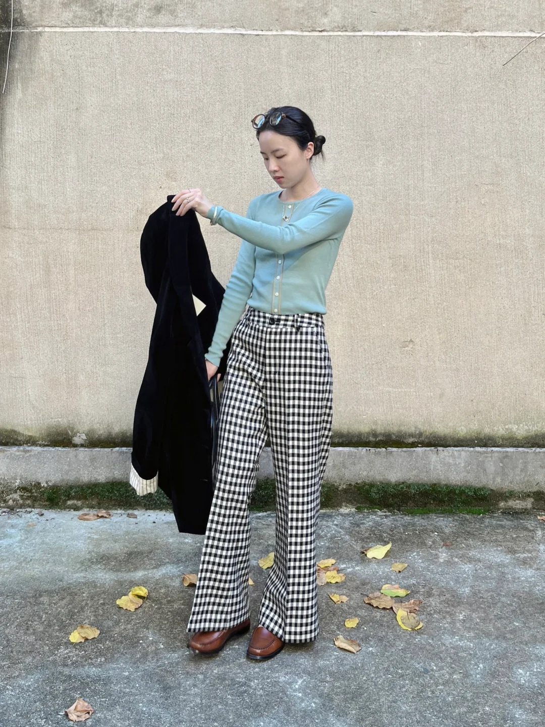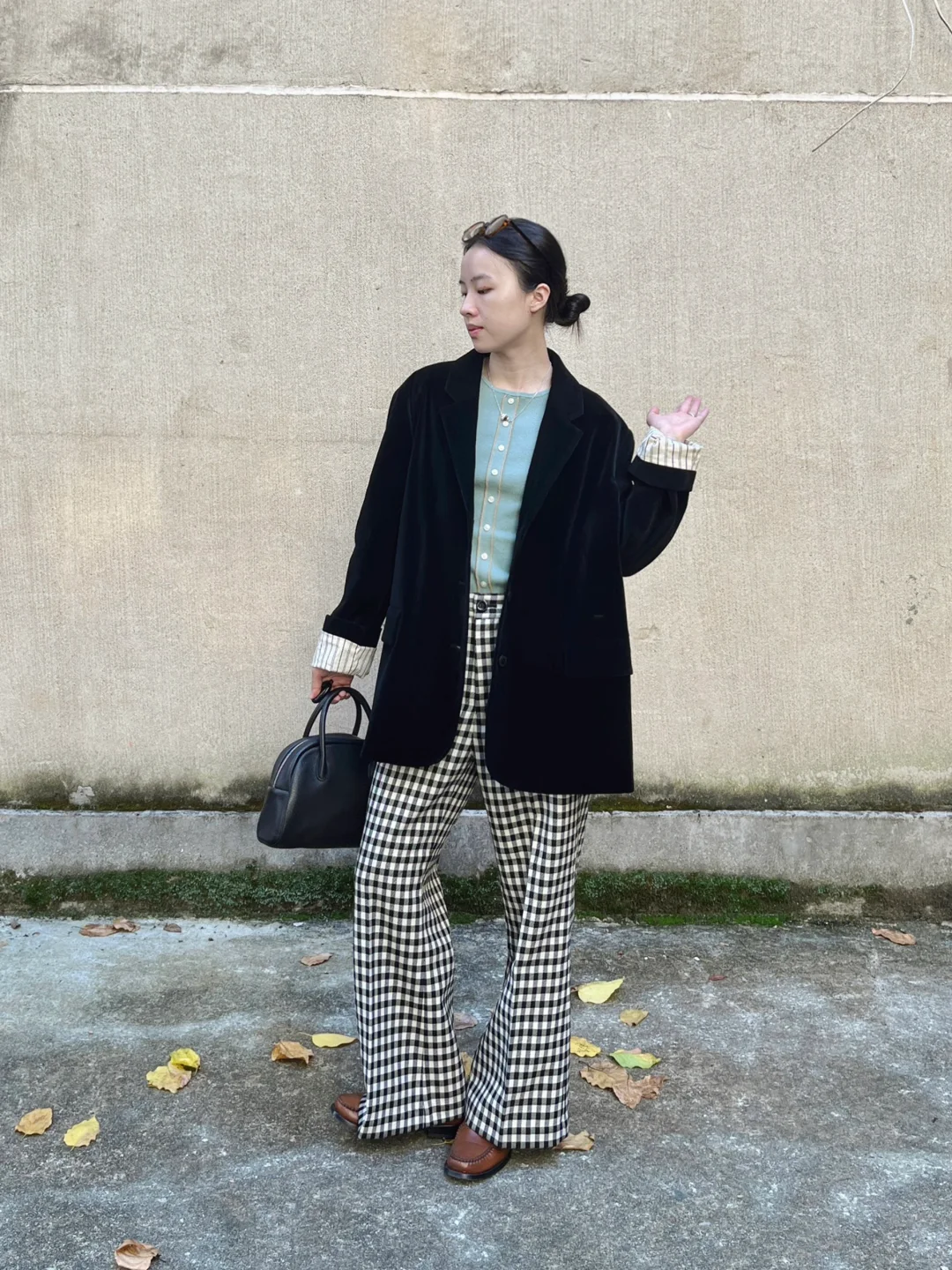 撞色复古的秋|大外套和格纹微喇裤绝配
