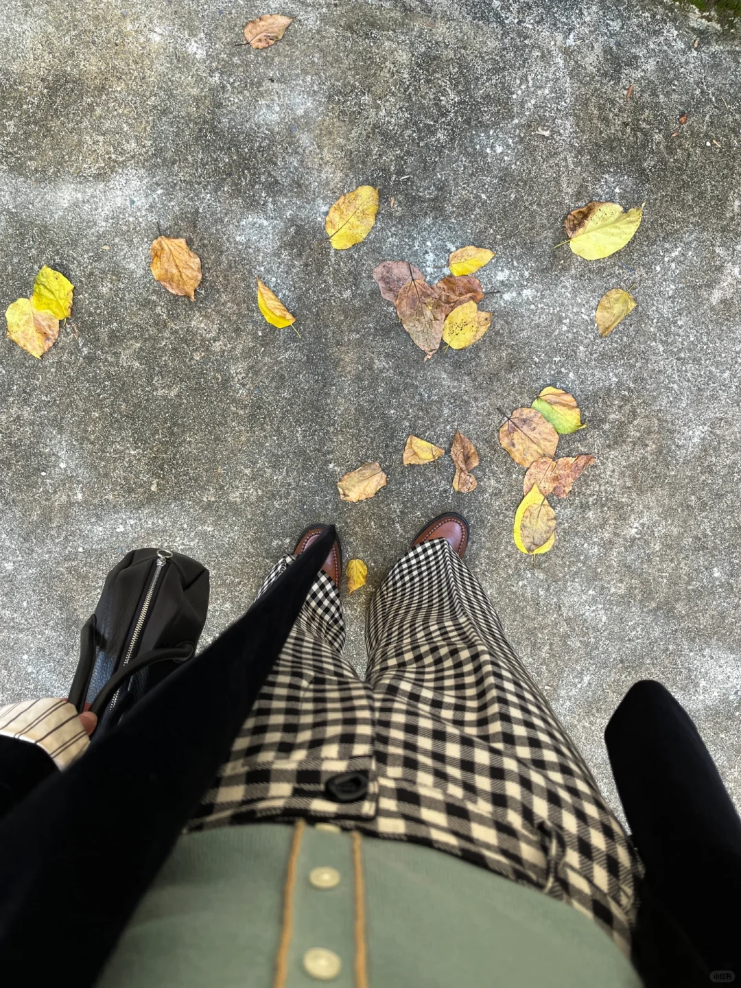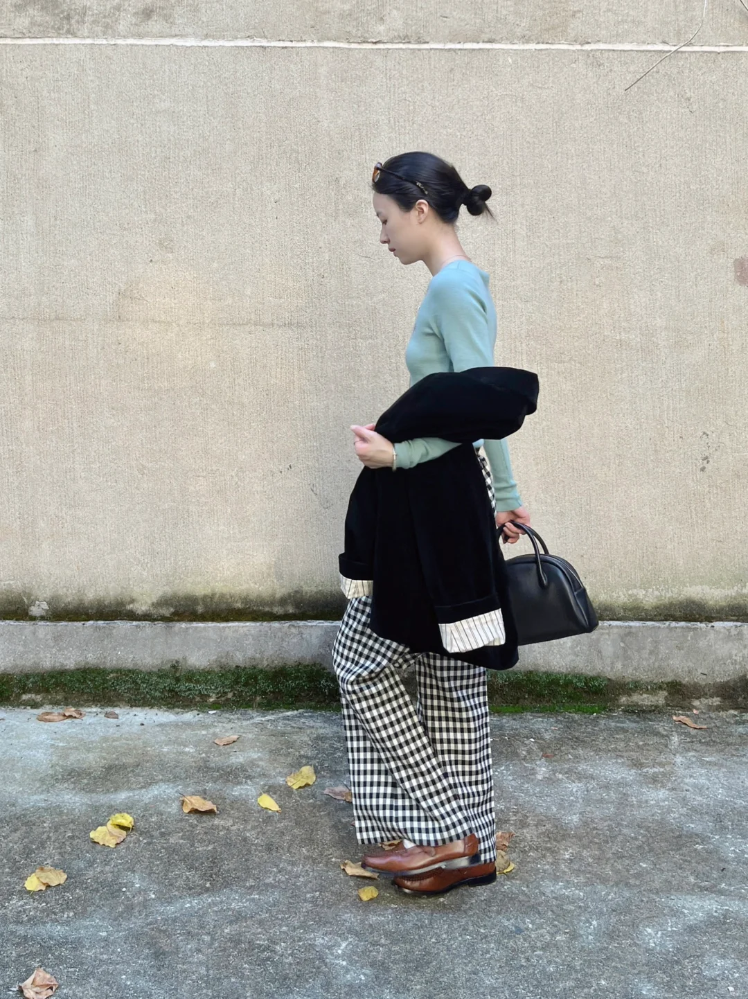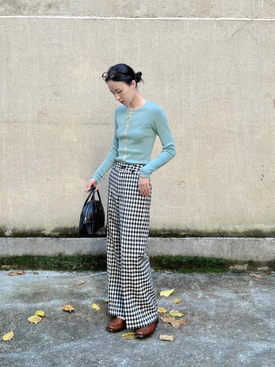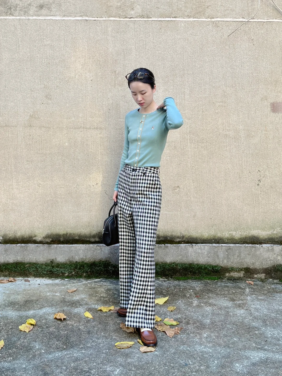 撞色复古的秋|大外套和格纹微喇裤绝配
