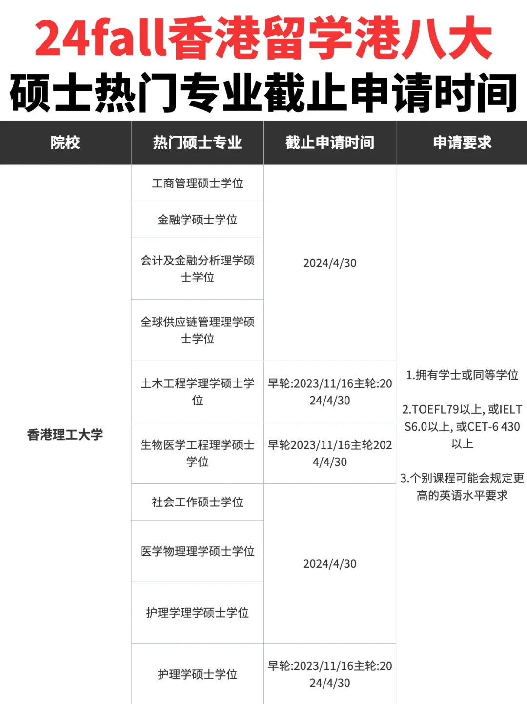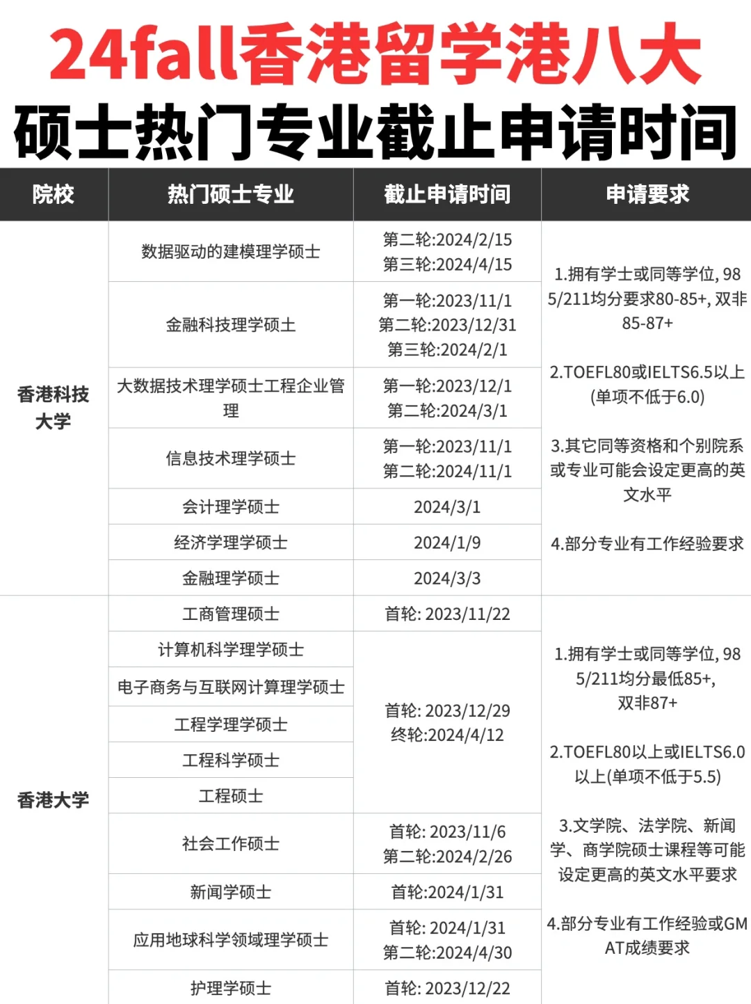 今天主要给大家整理了港八大24fall热门硕士专业申请截止时间⭕,还没有申请的宝子看好时间节点,不要错过了申请时间⏰。
