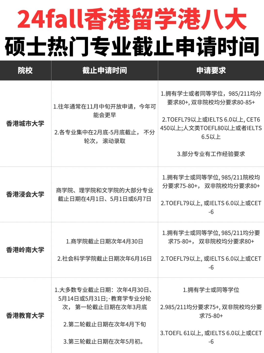 24fall香港硕士申请已经进入白热化阶段🔥,大部分院校第一轮申请时间已截止,除了香港城市大学,其他院校已经进入主申轮次⏰。