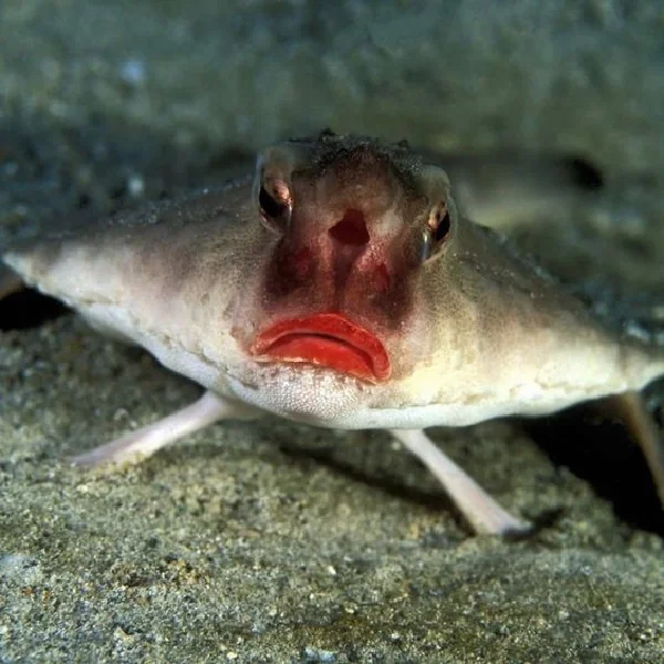 🍀红唇蝙蝠鱼身体平扁,尾部粗短。头平扁,宽大,平扁形。吻短,红色,有吻棘。眼大。当蝙蝠鱼成熟的时候,它们的背鳍会变成一个棘状突起,科学家推测其具有诱捕猎物的功能。特殊的是它有四条“腿”,有着一个大头,用胸鳍在海底“行走”。成年时,其背鳍会长成类似头角的刺状,投影来引诱猎物。长相真的很特别。