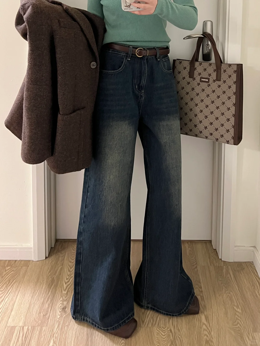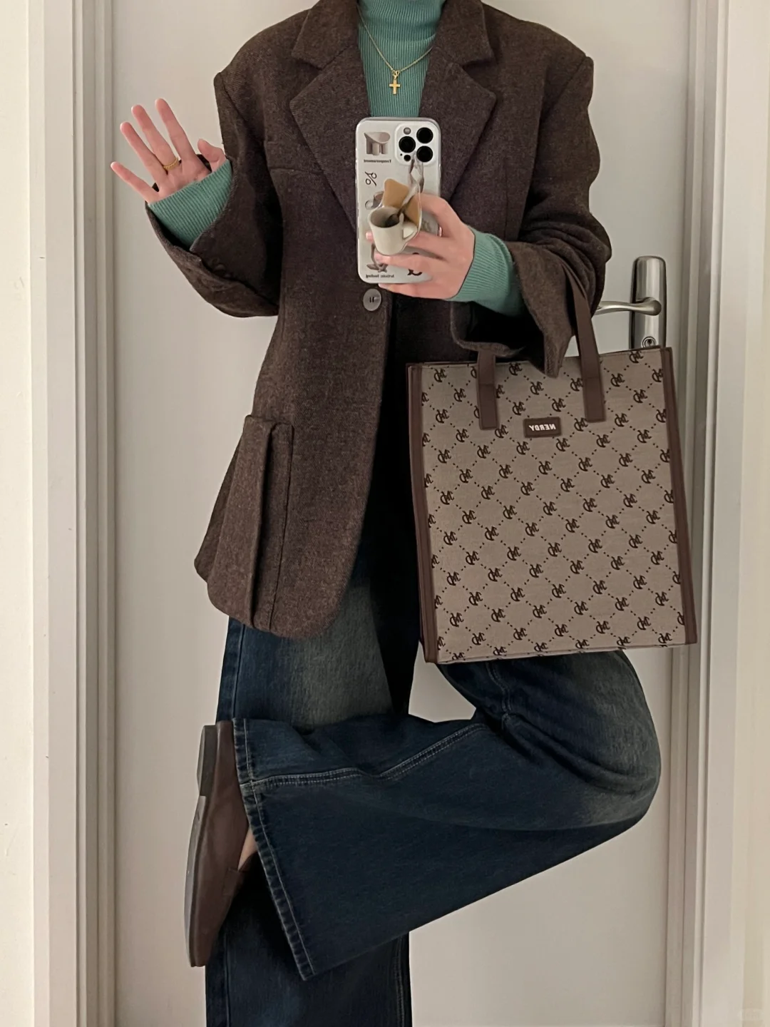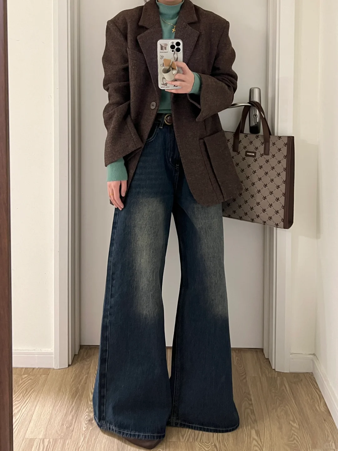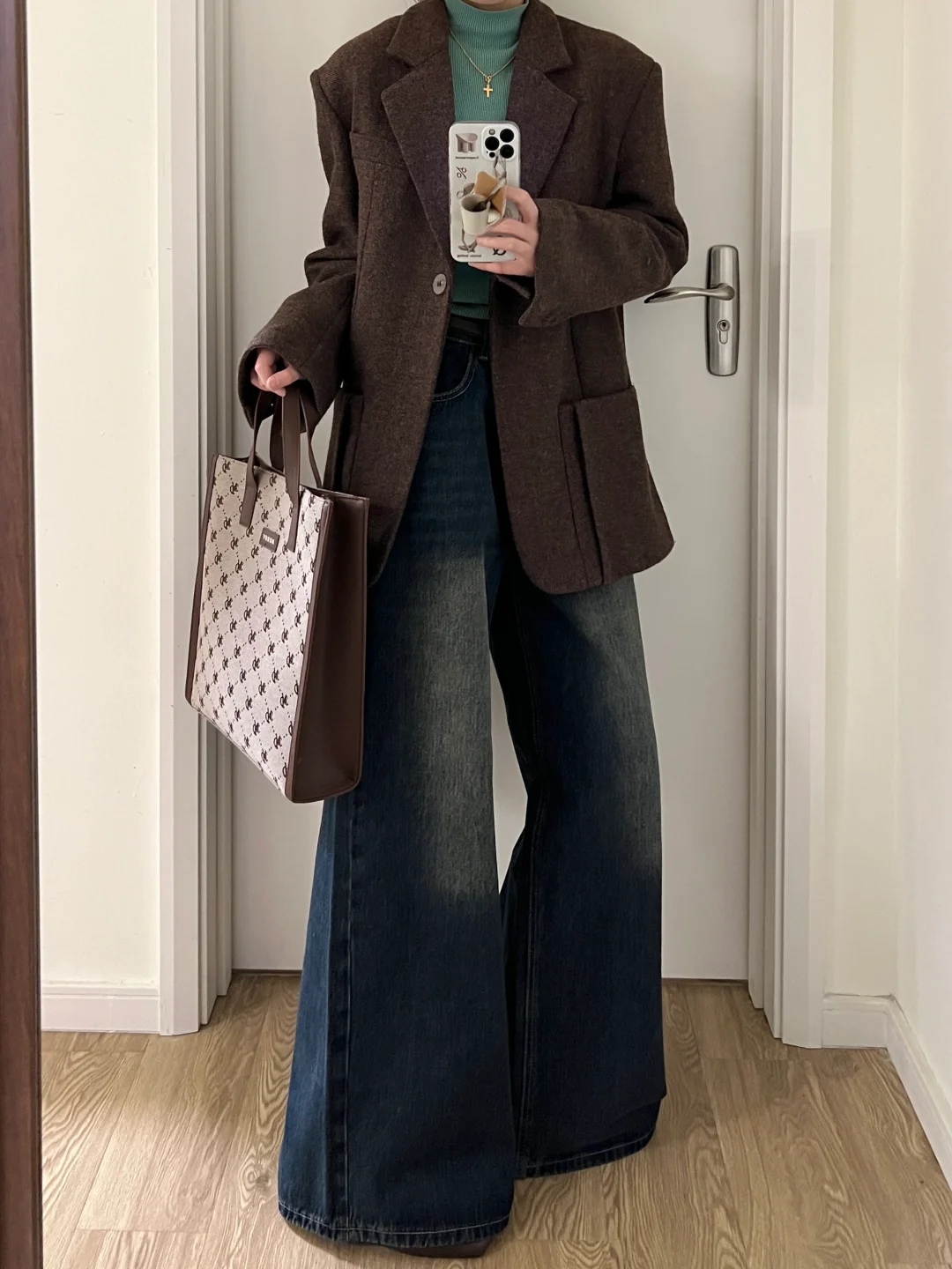 早春韩系复古|棕咖西装+湖绿毛衣+蓝牛仔裤