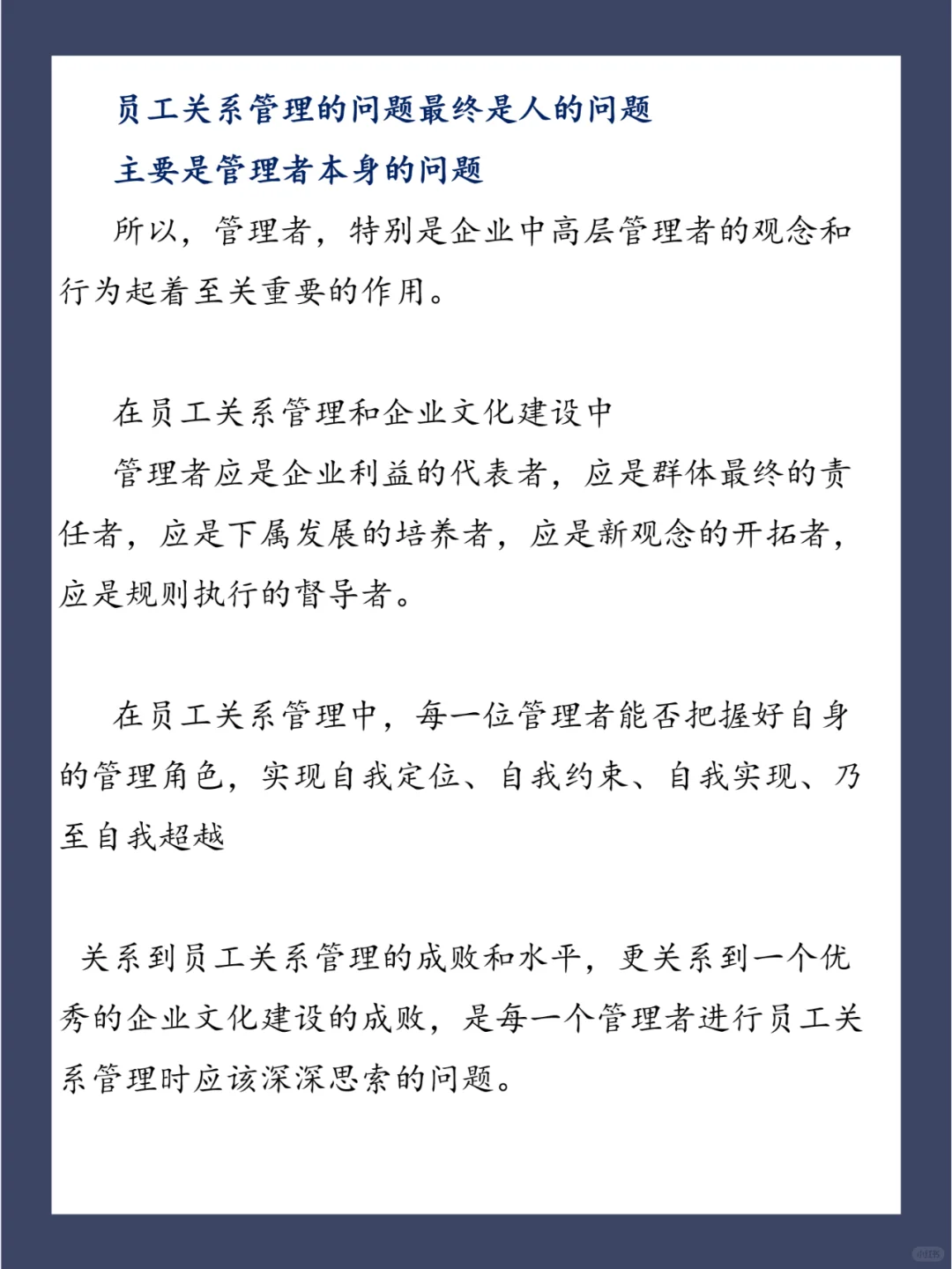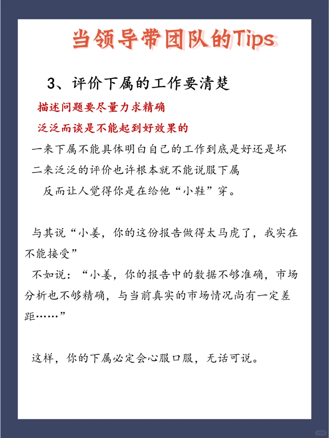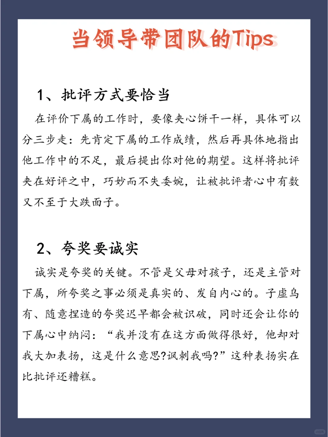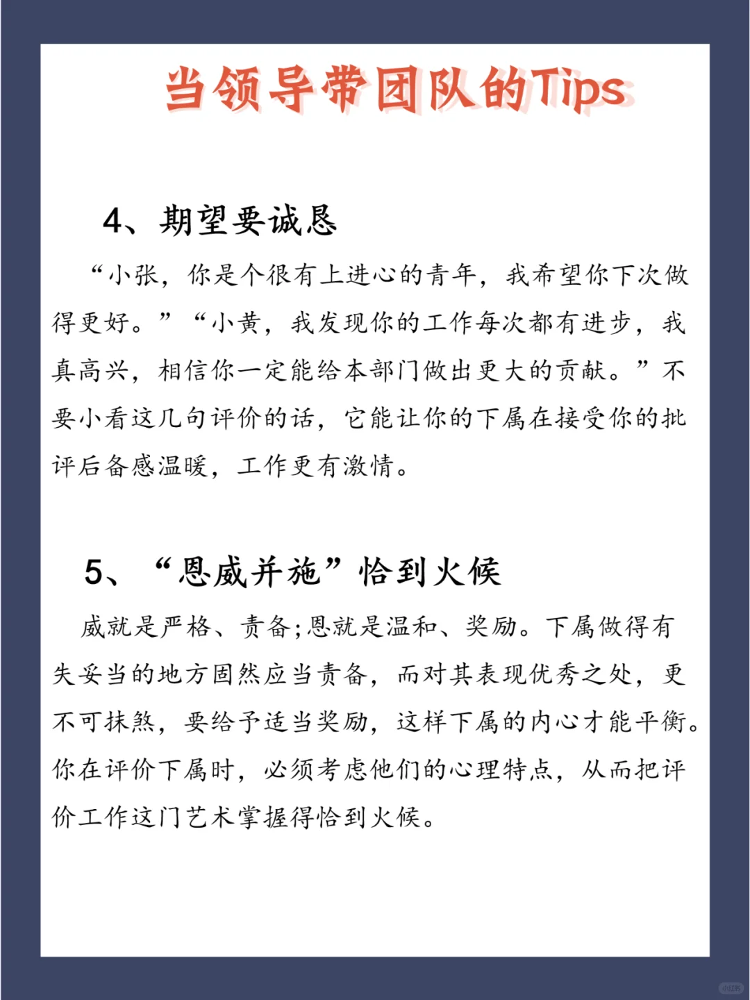 员工关系管理的问题最终是人的问题,主要是管理者本身的问题。 所以,管理者,特别是企业中高层管理者的观念和行为起着至关重要的作用。 以下5个Tips分享给大家,好的领导都再用! 1、批评方式要恰当 2、夸奖要诚实 3、评价下属的工作要清楚 4、期望要诚恳 5、“恩威并施”恰到火候