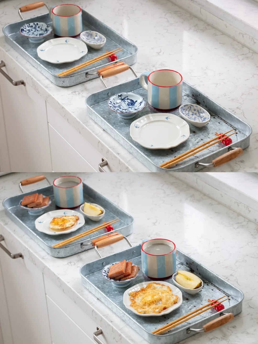 早餐:黑豆浆➕玫瑰花豆沙包➕煎蛋➕煎午餐肉➕苹果。