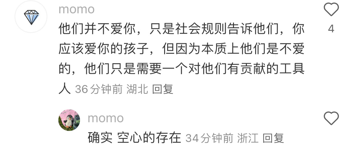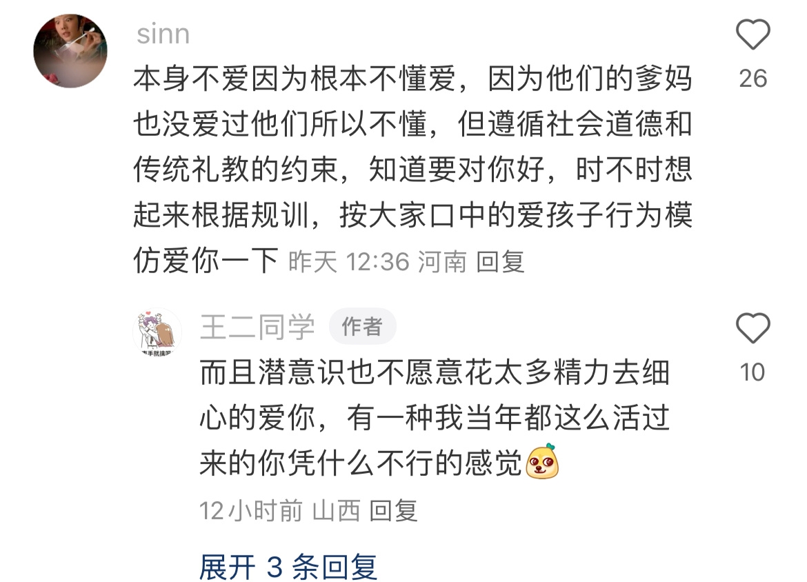 很多时候都觉得爸妈有一种表演性质的爱,这种爱流于表面也很敷衍