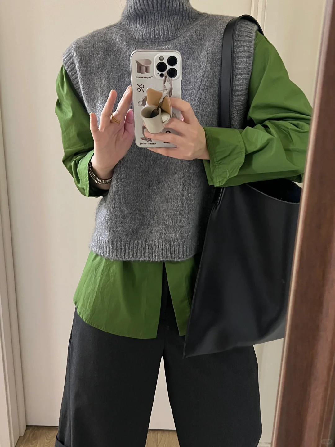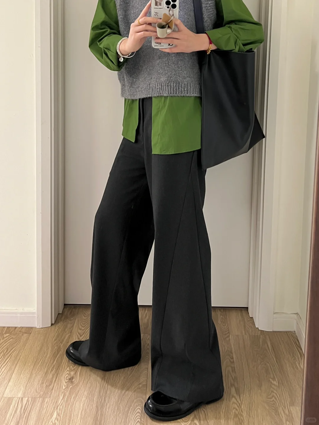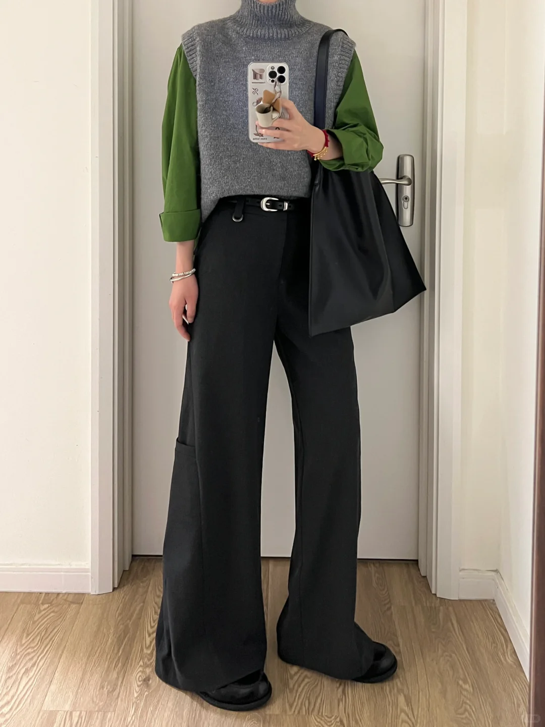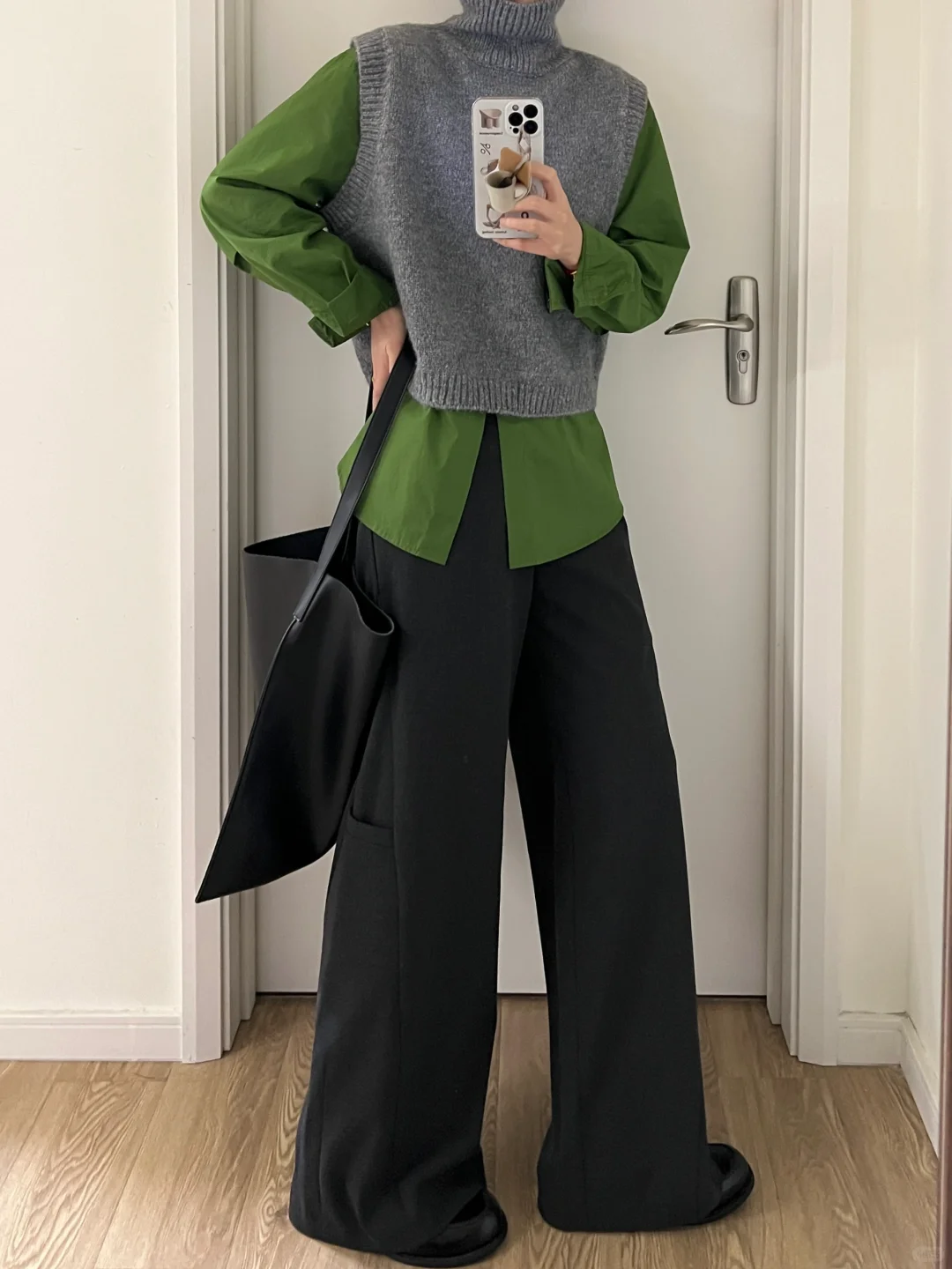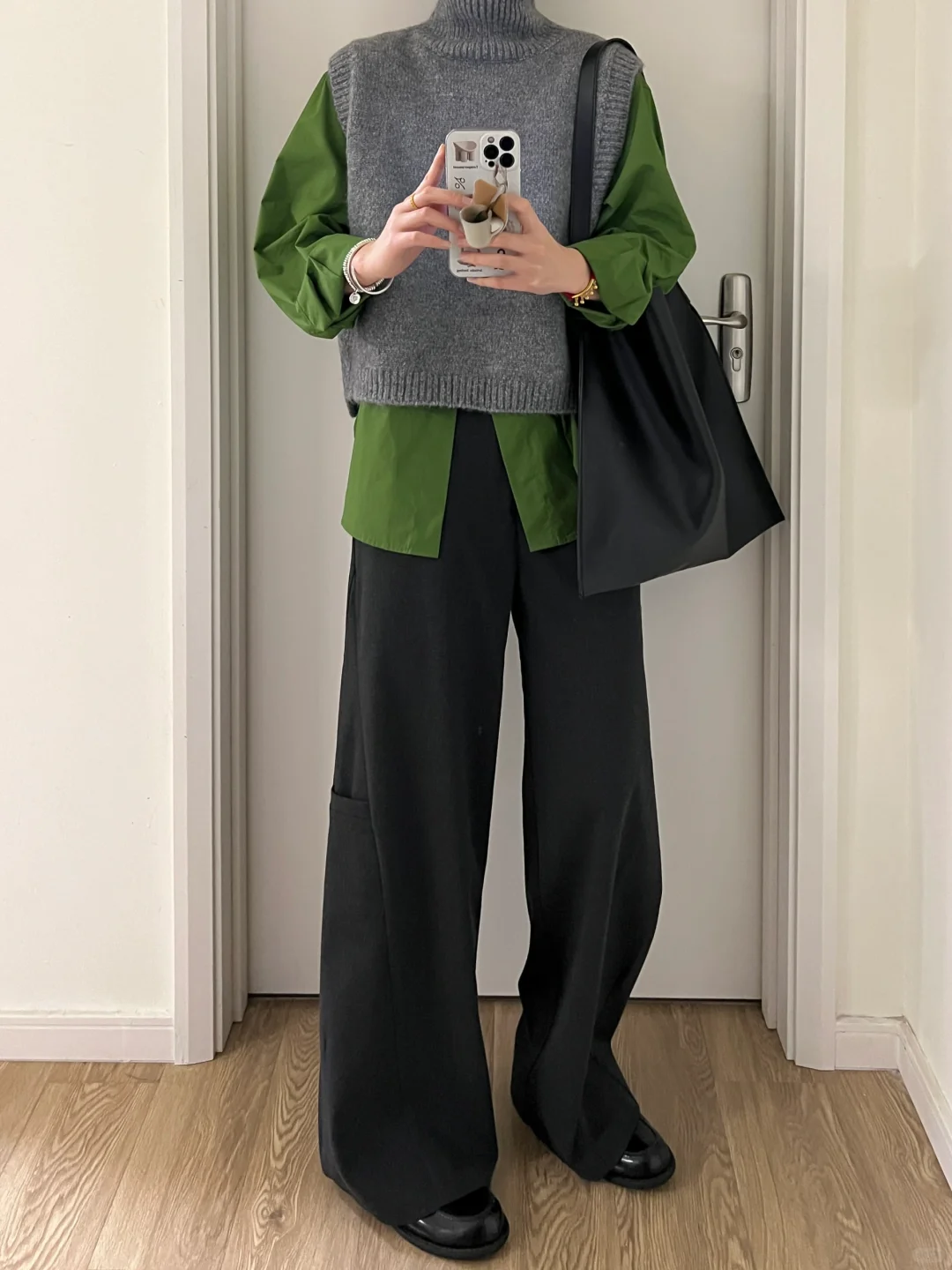 早春韩系休闲|绿衬衫+灰马甲+灰阔腿西裤