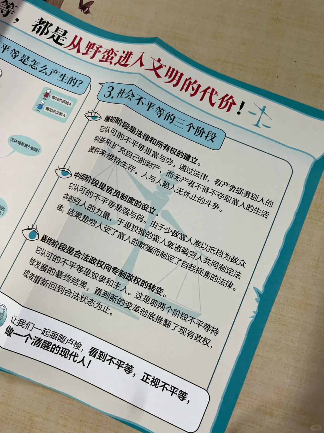 作者认为,人类本性善良,但随着不断发展,人性发生了变化。对于原始人来说,吃得饱饭,便与世无争。而文明人的欲望没有止境。作者总结了不平等的三个阶段。第一阶段是法律和所有权的设立,在此阶段不平等,表现为穷与富的对立;第二阶段是官员制度的设立,在此阶段不平等表现为强与弱的对立;第三阶段是合法政权向专制政权的转变,此阶段的不平等表现为奴隶与主人的对立。
