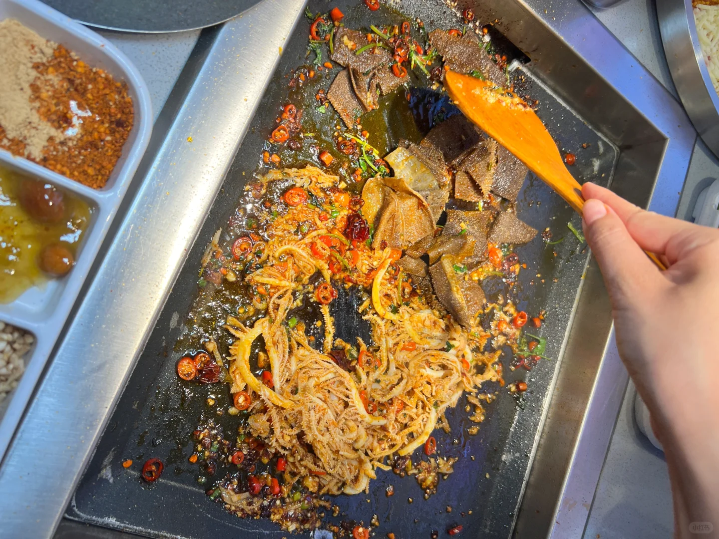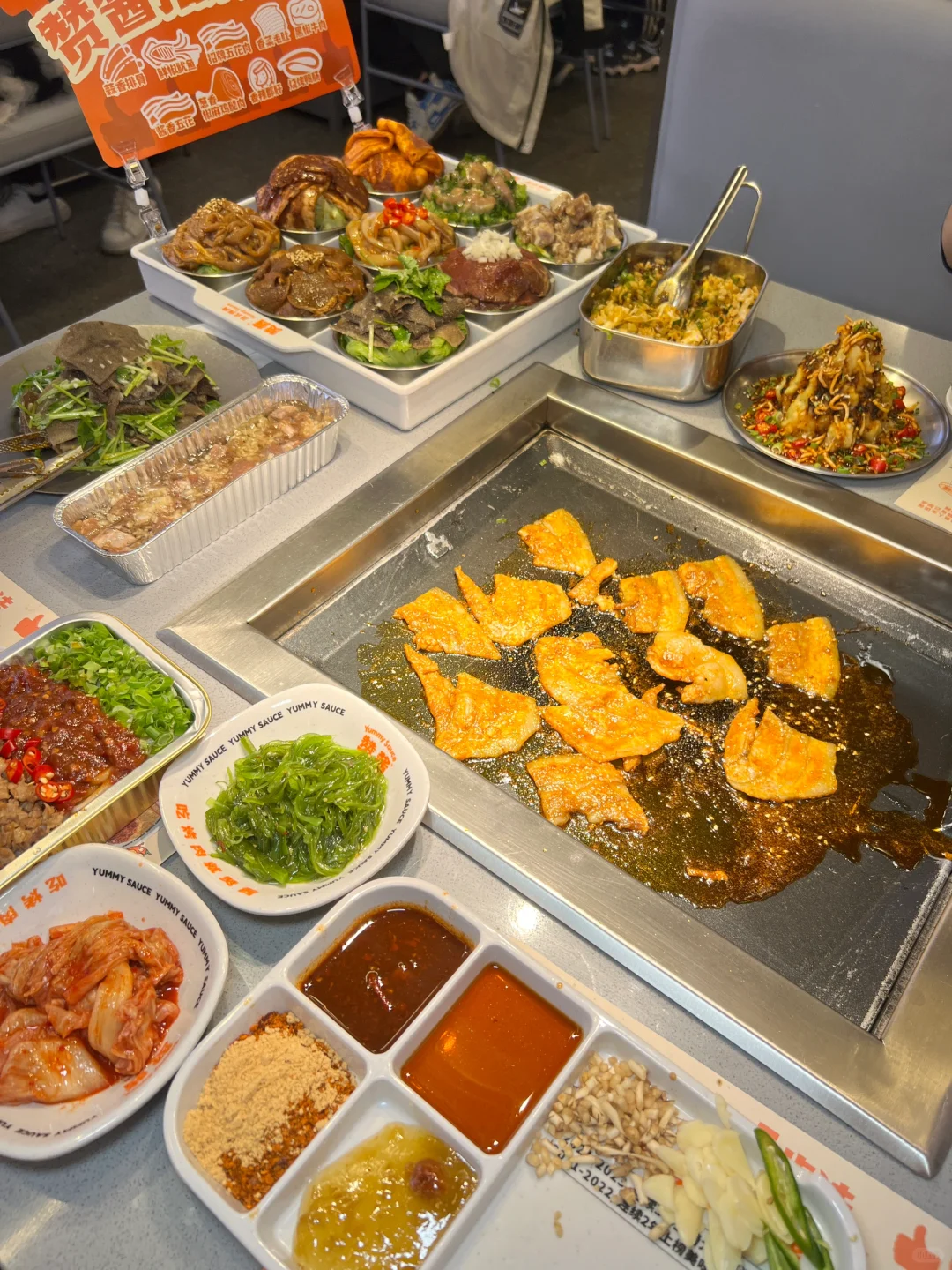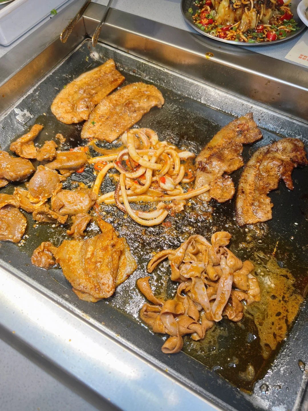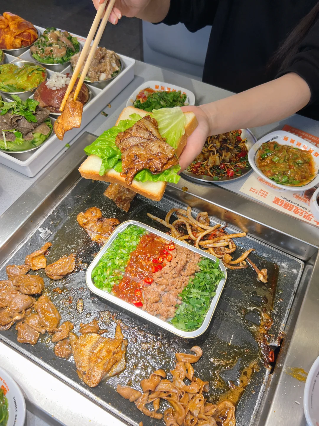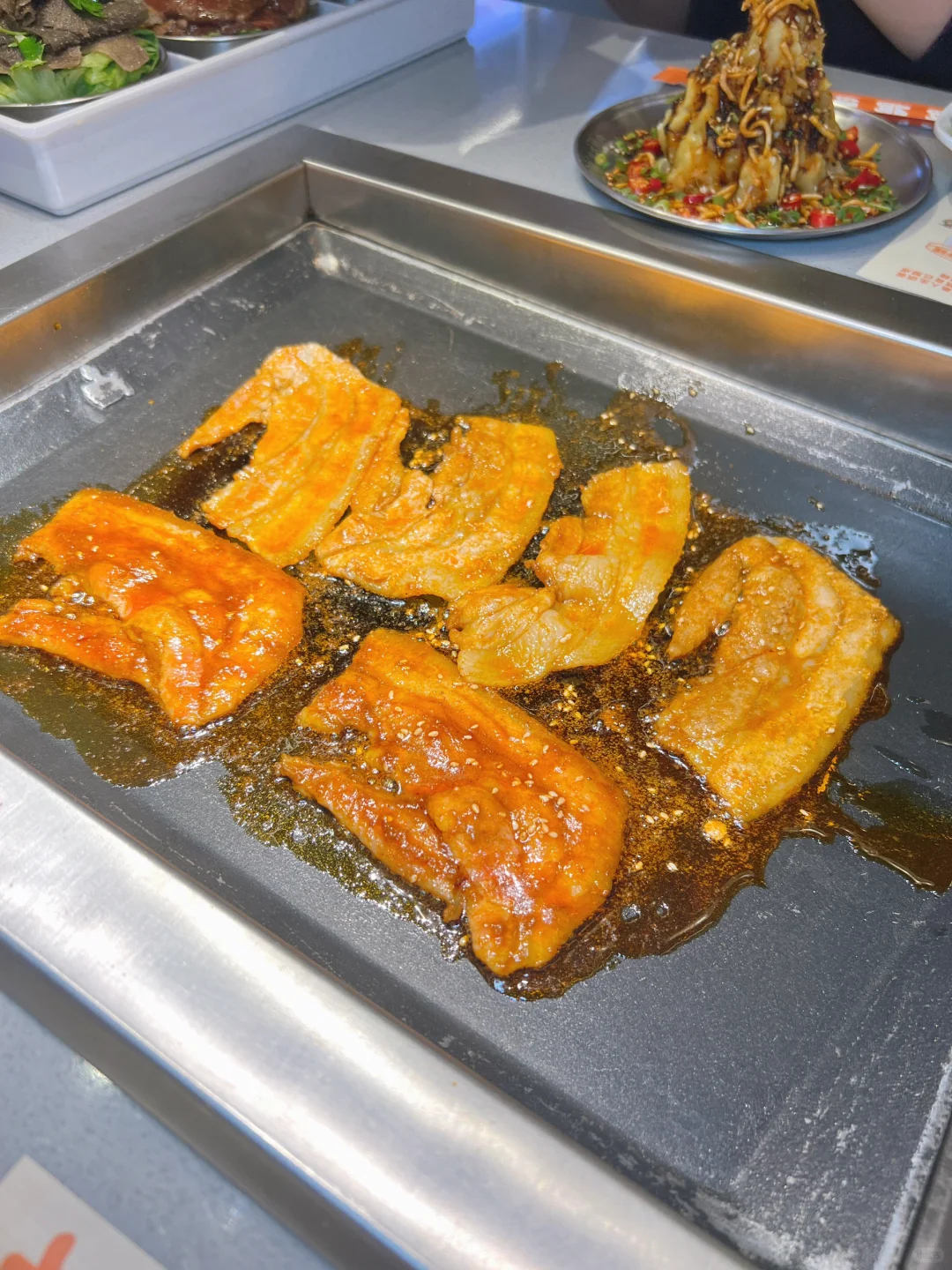 这家在海亮摩尔地下街夜上海街区 叫赞酱川式烤肉 爱吃辣的别错过他家 招牌的五花肉是腌制过的 味道很足 还有毛肚这种火锅菜也能烤 竟然还有烤米线和烤排骨! 太特别啦! 他家小料种类很多 而且还有折耳根 烤盘是铁板的 服务员帮烤 还有很多暖心服务 消食片、烫伤膏、装手机的塑料袋、口罩😷 小饮料也是免费的 还没吃过他家的快去试试吧!