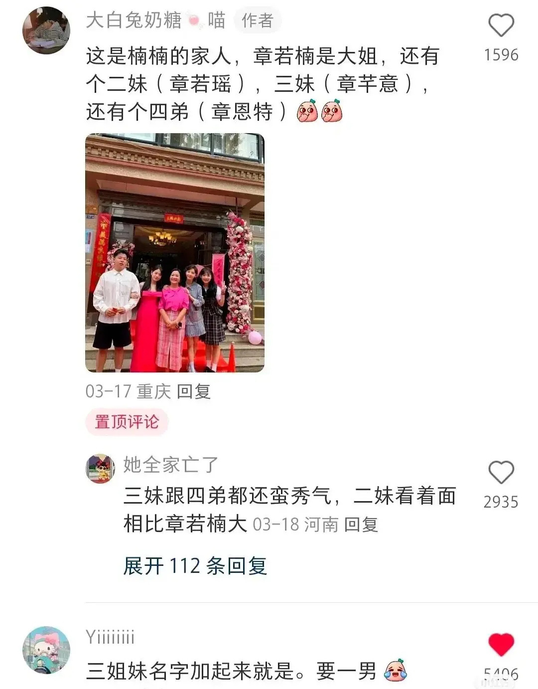 #章若楠原名#看到网友解读章若楠三姐妹的名字加在一起就是“要一男”,章若楠的原名也是章若楠…