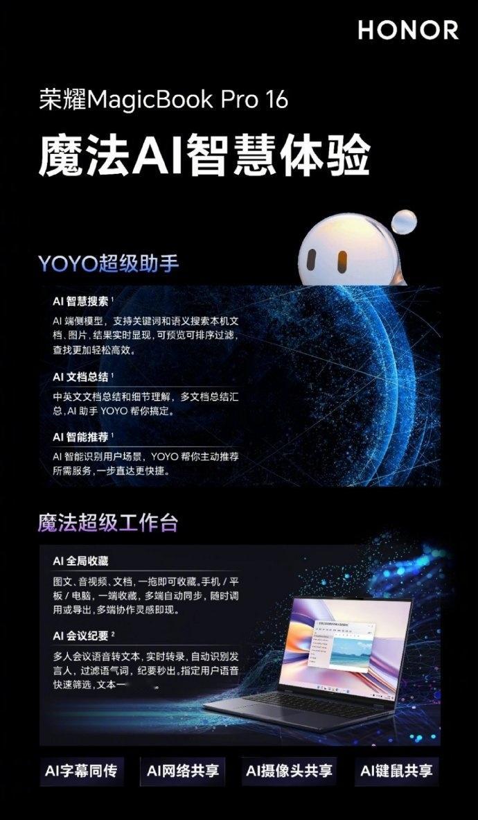 而#荣耀笔记本#主打 AI PC,#荣耀MagicBookPro 16# 开启笔记本高性能静音时代,4月全新版本推送, 注重性能、超低噪声。而且AI功能也比较丰富,从搜索、文档总结、字幕同传、网络共享再到AI会议纪要,统统支持。另外还实现硬件功能的AI,比如AI摄像头共享、AI键盘鼠标共享。