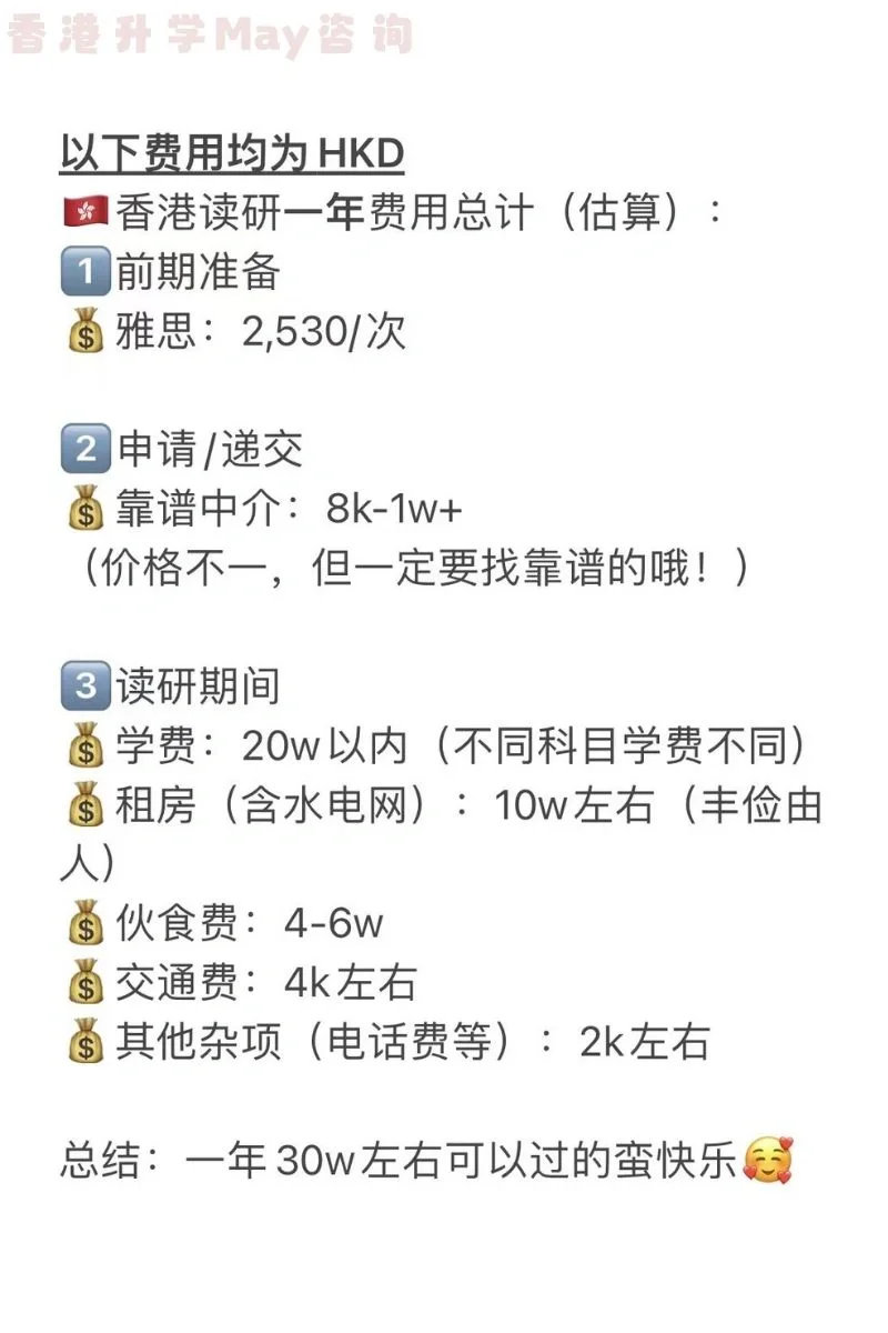 相信很多同学想来香港读研都会考虑费用💰问题。心里没底,不知道除了学费之外的花销大概需要多少🤔。今天May就粗略计算了一下普通家庭一年港硕的花销。