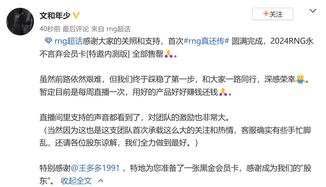 RNG一场直播赚了上百万么啊?看超话有人发的截图有点厉害啊。要是早几年RNG这样运营,感觉千万起步了。超话氛围挺好的,全是加油和鼓励~[全力以赴]