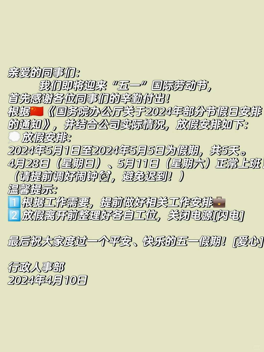 我们即将迎来“五一”国际劳动节,首先感谢各位同事们的辛勤付出!根据🇨🇳《国务院办公厅关于2024年部分节假日安排的通知》,并结合公司实际情况,放假安排如下: