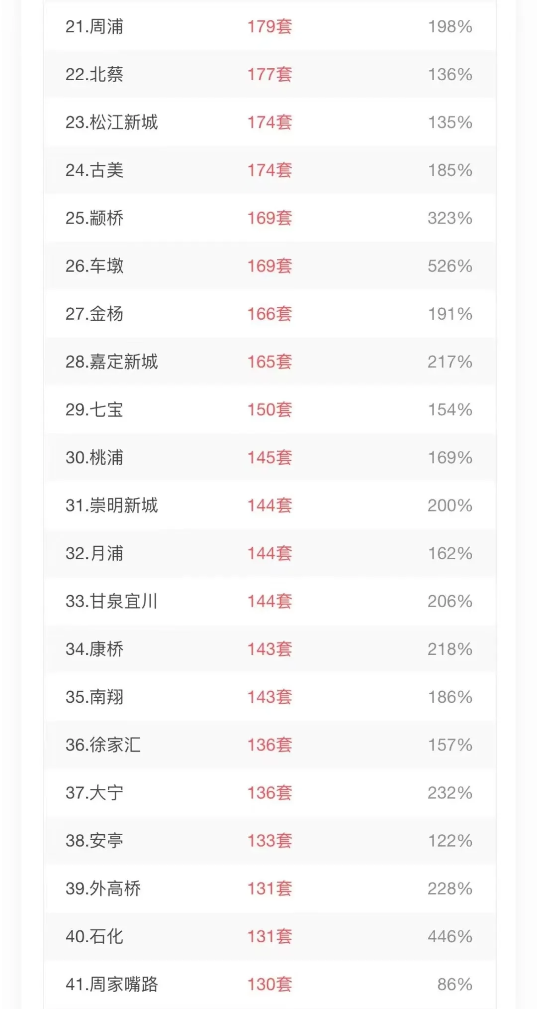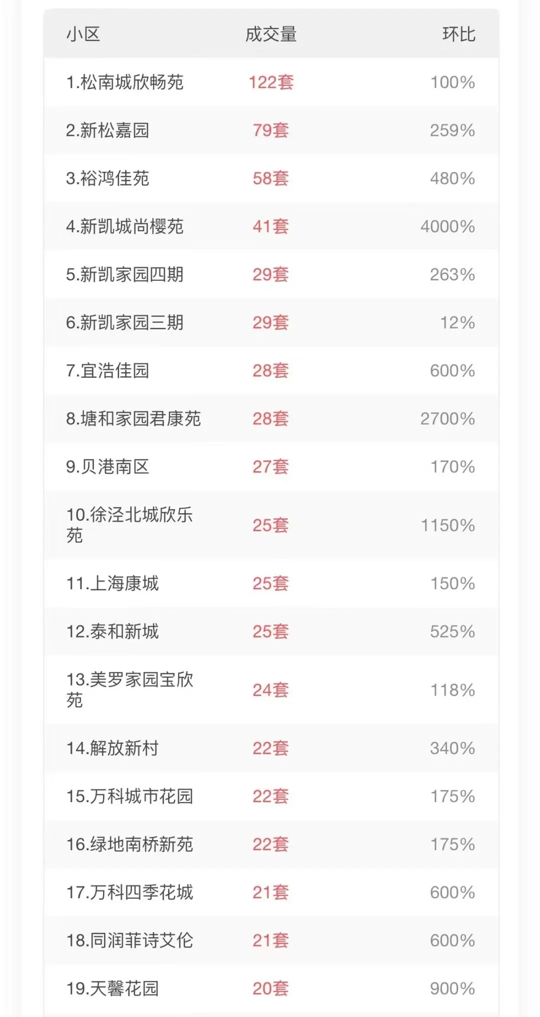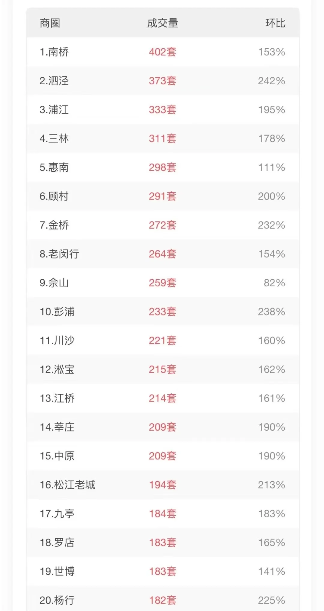 数据来源于兔博士。网签价格不代表实际成交。 成交量板块角度,外环外还是主力,奉贤南桥,松江泗泾,闵行浦江,浦东惠南等等, 中环区域,三林,金桥领先,体现了这两个板块的地理位置优势,通勤优势,以及生活配套优势。 小区方面,则和小区规模严格相关,比如上海康城,成交量总归靠前的,但不代表小区房子好卖。