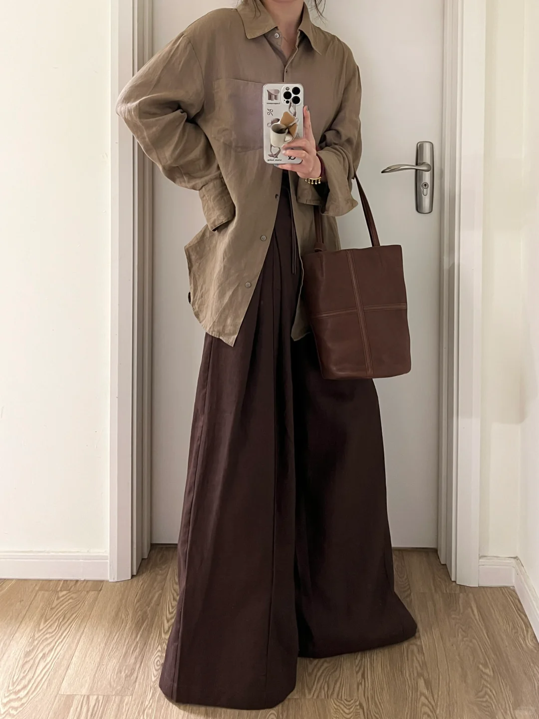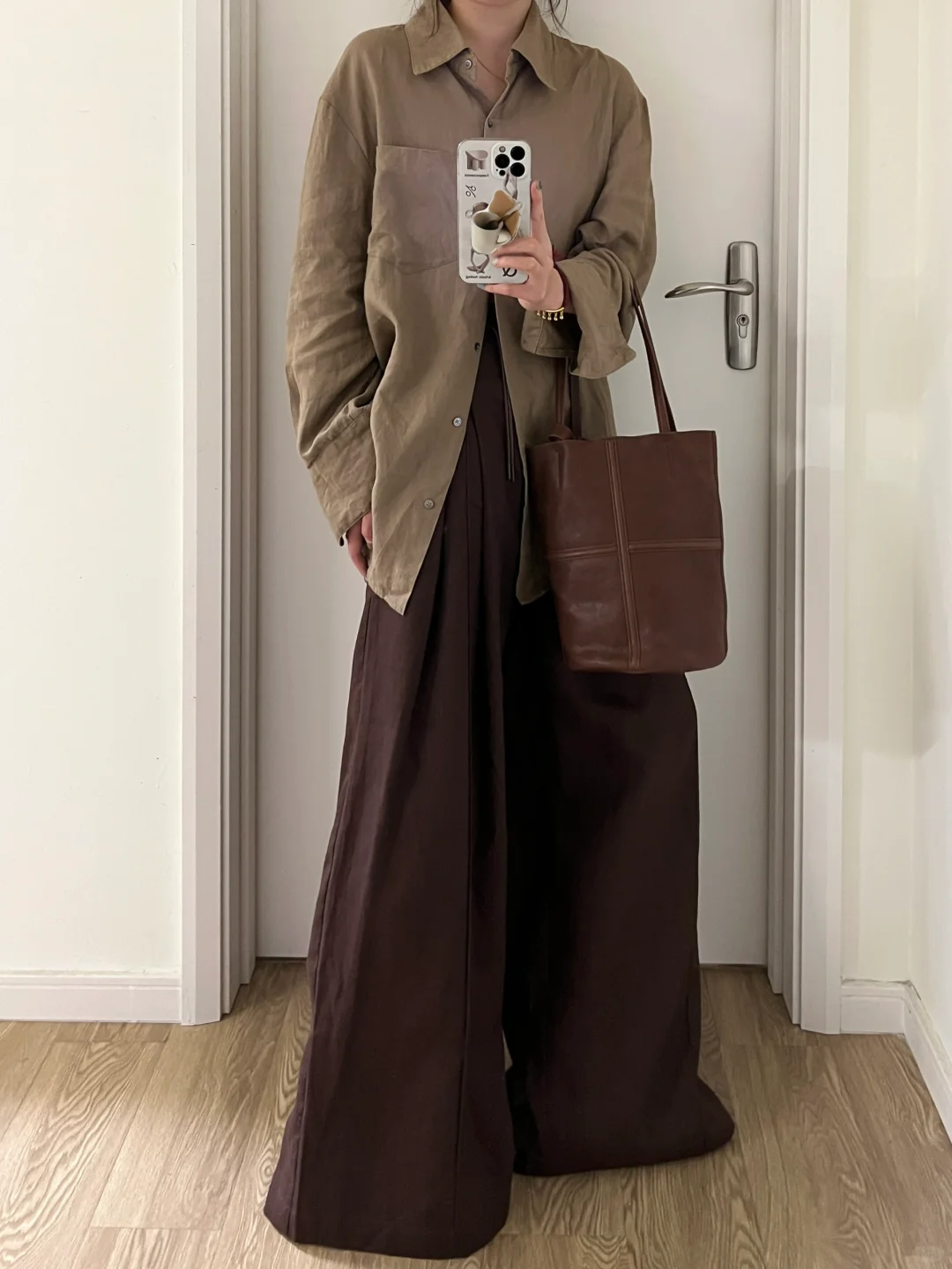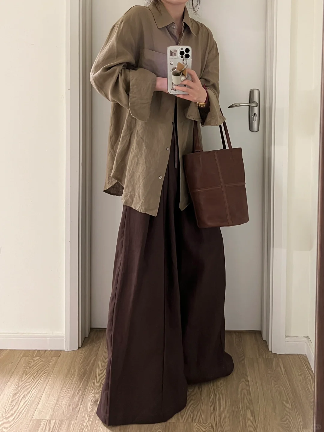 无棉麻不春夏哈哈哈! 茶咖色棉麻衬衫+暗调红棕亚麻阔腿裤 慵懒随性调调!