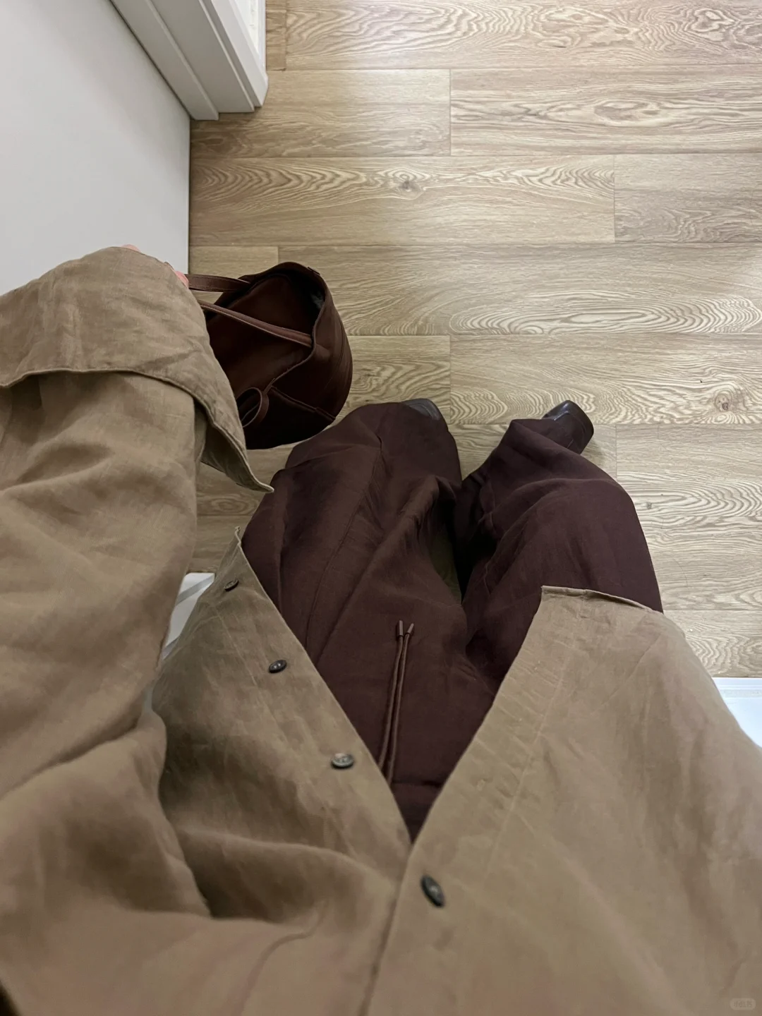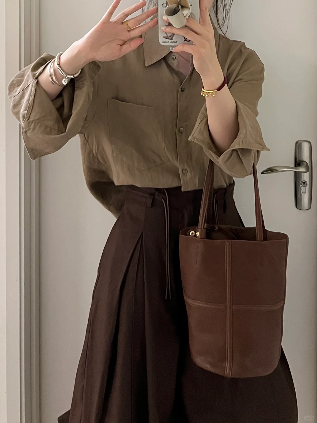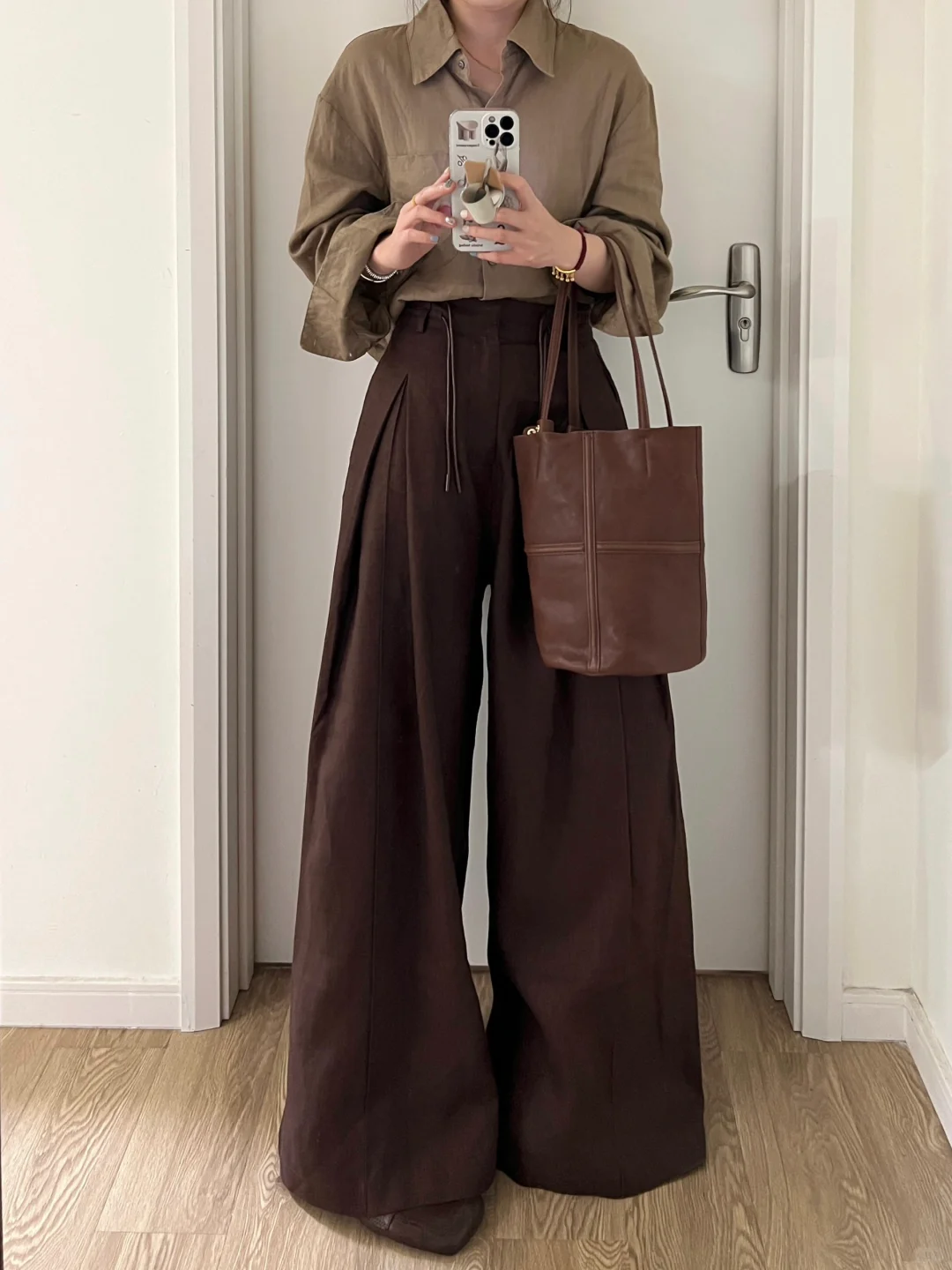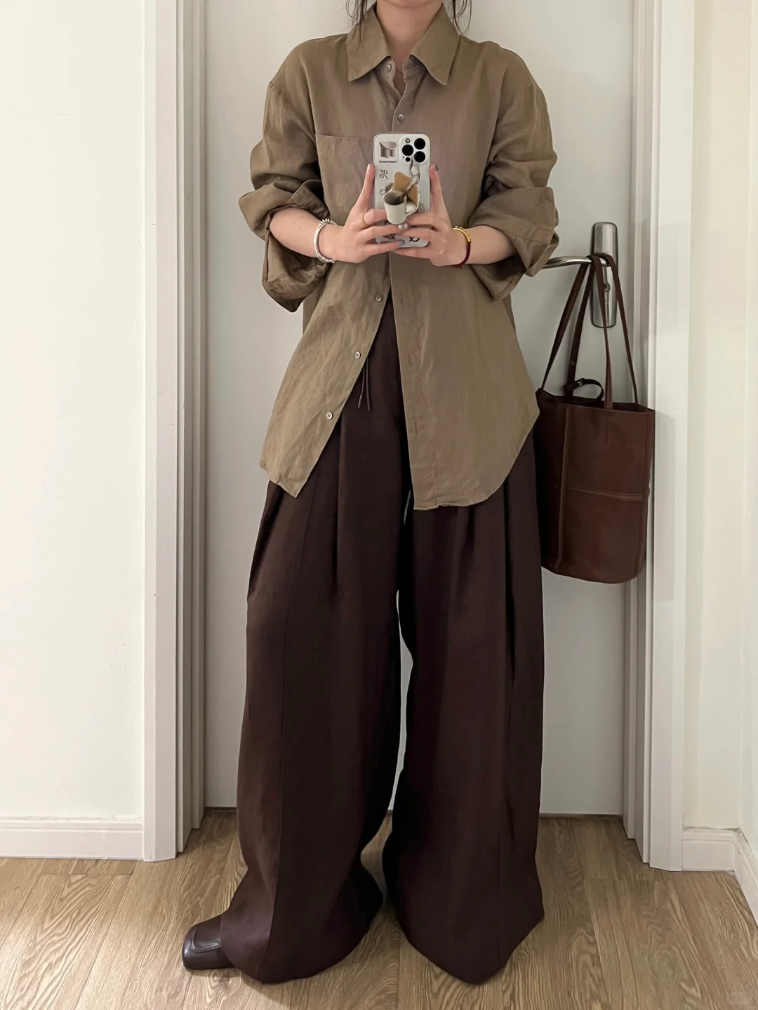 无棉麻不春夏哈哈哈! 茶咖色棉麻衬衫+暗调红棕亚麻阔腿裤 慵懒随性调调!