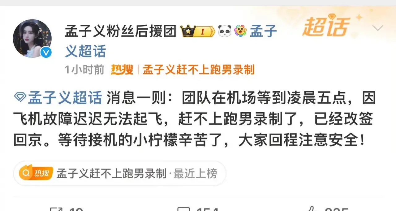 #孟子义赶不上跑男录制#孟子义由于飞机延误的不可抗力因素,而无法来到重庆录制奔跑吧,真的好遗憾!