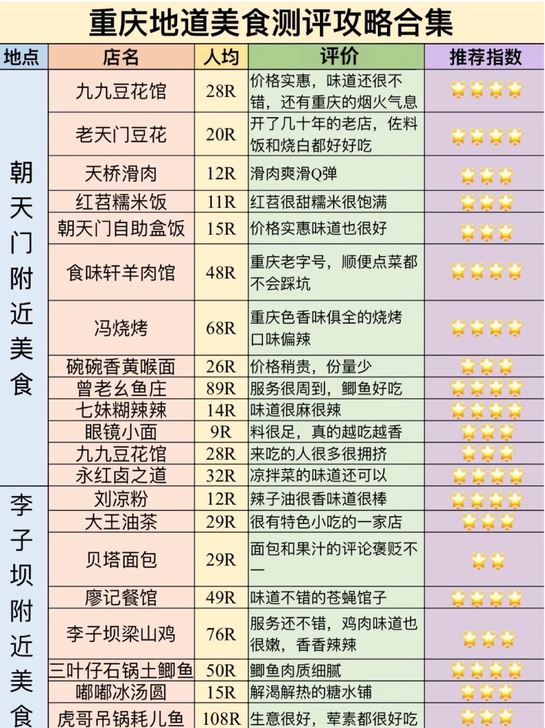 📍解放碑附近美食 熨斗糕老烧饼 老丘丘 琳香麻辣 光头小炒 梯坎板凳面 聂发财来凤鱼 📍朝天门附近美食 九九豆花馆 老天门豆花 天桥滑肉 红苕糯米饭 朝天门自助盒饭 食味轩羊肉馆 📍李子坝附近美食 刘凉粉 大王油茶 贝塔面包 廖记餐馆 李子坝梁山鸡 三叶仔石锅土鲫鱼 📍沙坪坝附近美食 好吃狗凉糕 胖子小吃 阿坤传统小吃 老太婆肥肠蹄花汤吃不亏 拜抄手 诗熠烤米线 📍弹子石附近美食 菜稀饭 巷巷跷脚牛肉 大佛饭庄 阿亮凉糕 胖子好盐水鸭 刘记盘龙烧烤