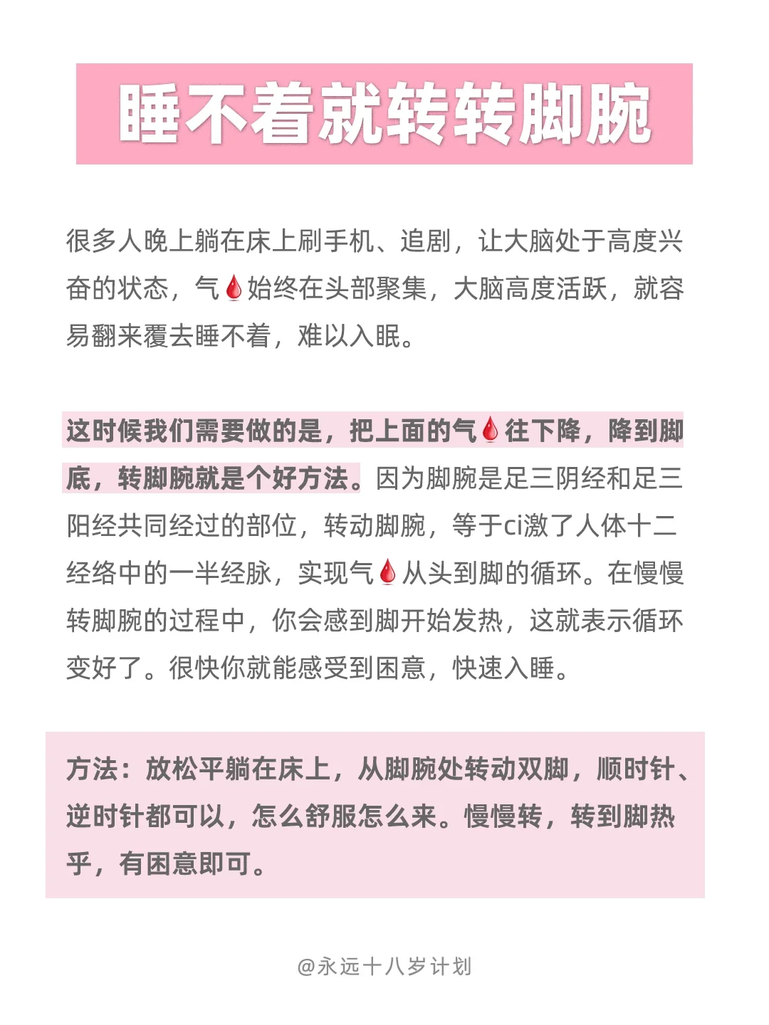 转脚腕就像催眠大师手里的钟摆一样,自己催眠自己。转完可以感觉到后背到后脑勺,都很放松,很快就可以入睡了~ 祝大家今晚都有个好梦[睡觉R]