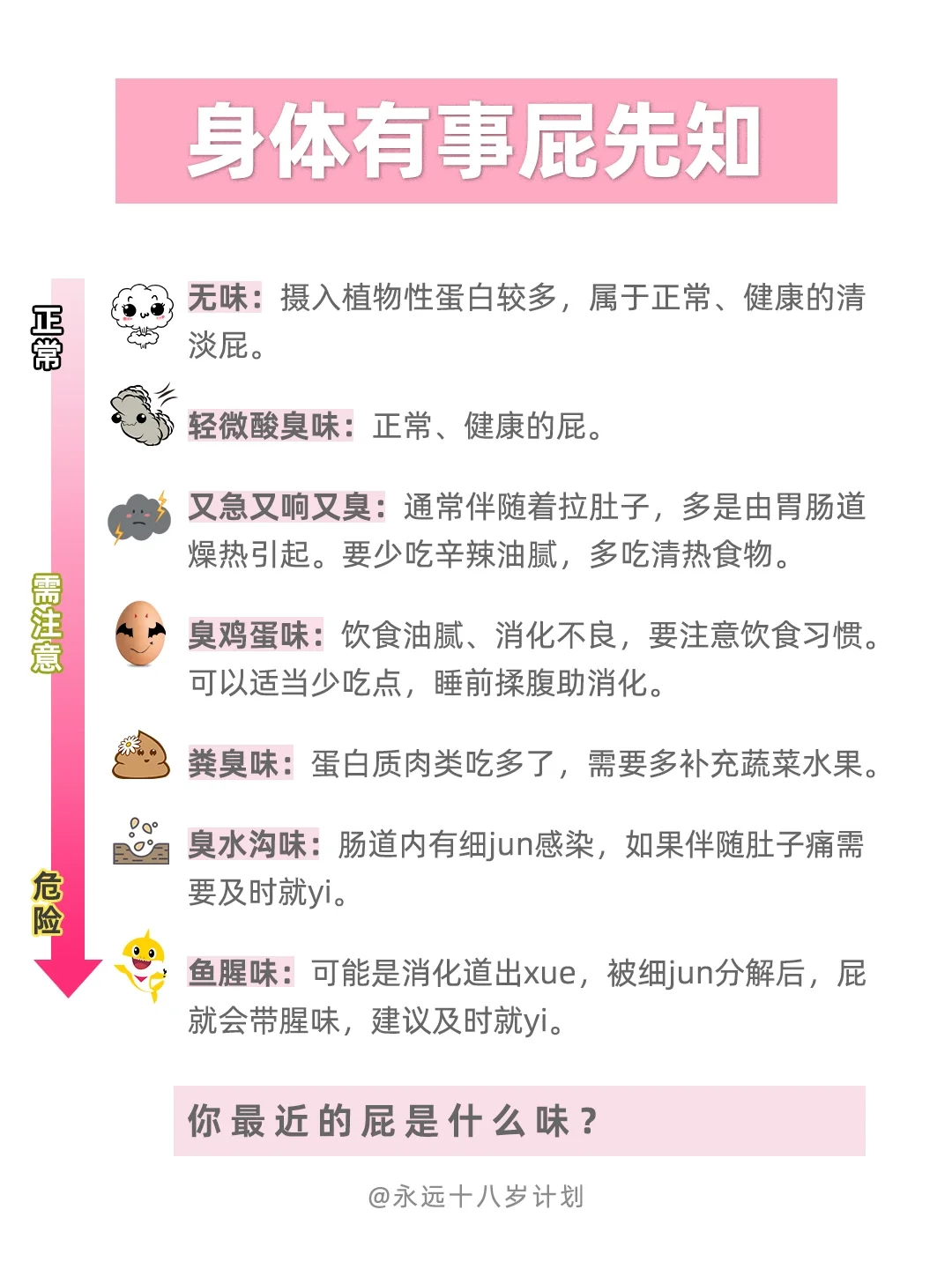 健康人1天约放屁5-20次,有的是能闻到的,有的是察觉不到的。当大家感觉到要放屁的时候,一定要正常放出来,不能憋!(特殊场合下除外) 因为屁不仅能帮助你知道身体状况,而且憋屁憋多了,还可能引起口臭或者胀气哦~