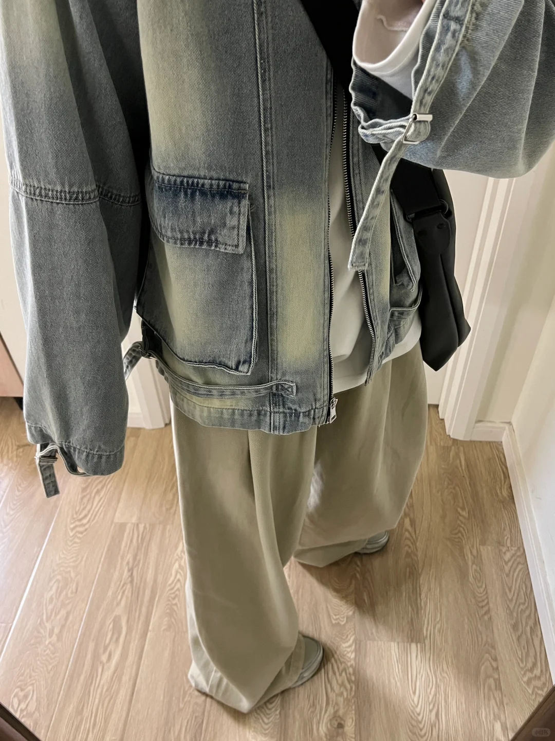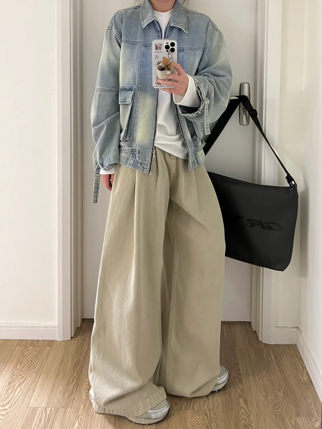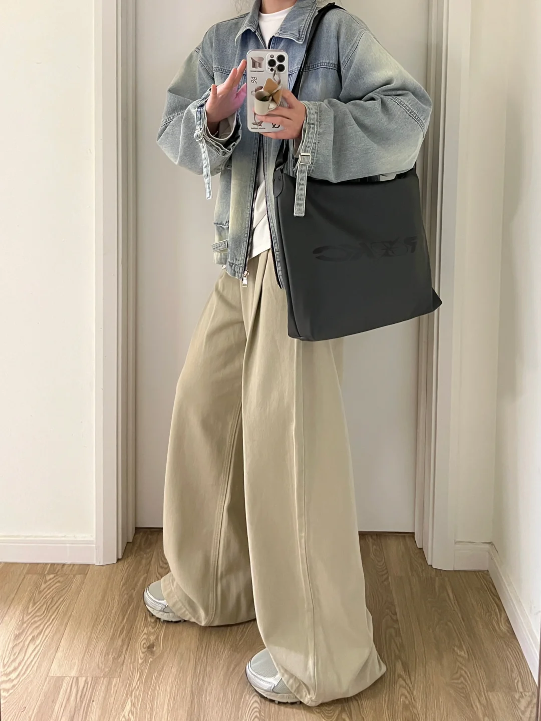 早春韩系休闲|浅蓝牛仔外套+白t+卡其阔腿裤