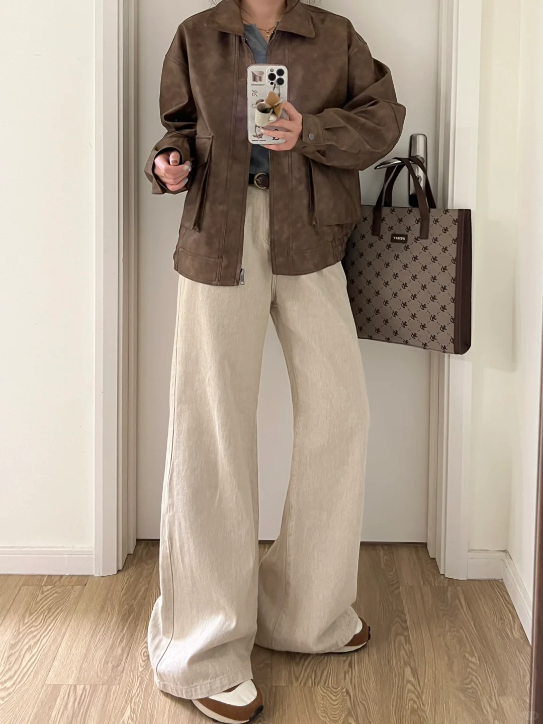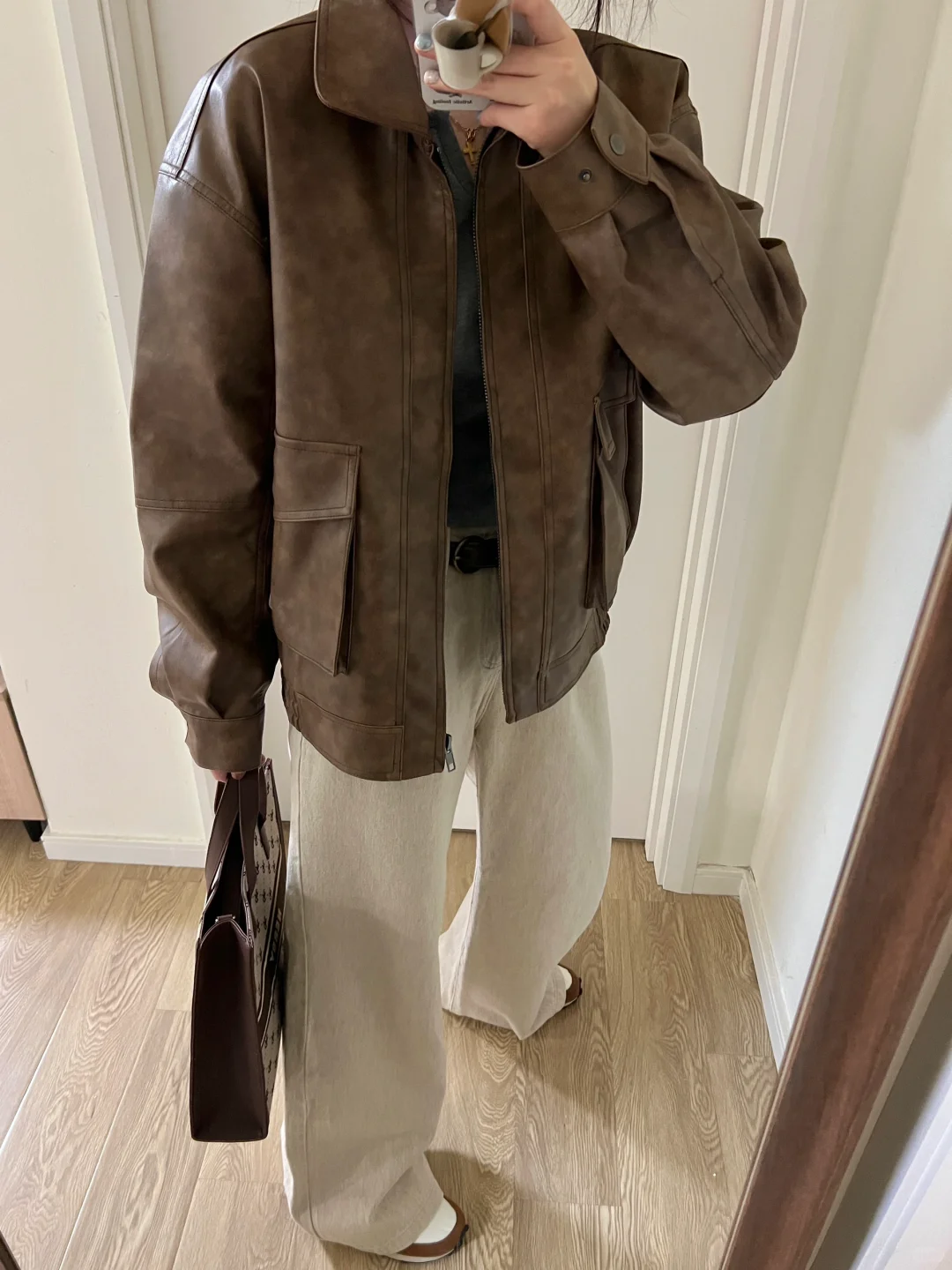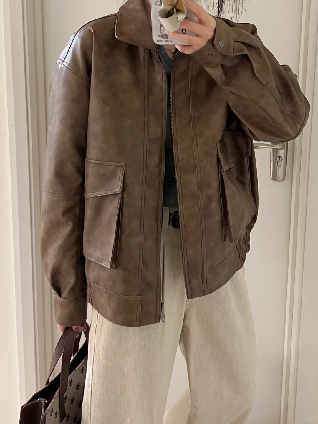 早春复古休闲|咖色皮衣外套+灰杏直筒牛仔裤
